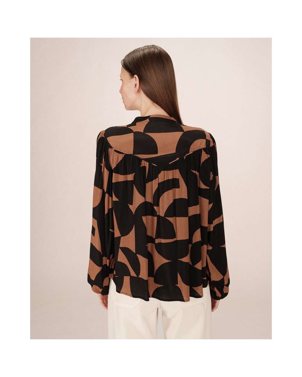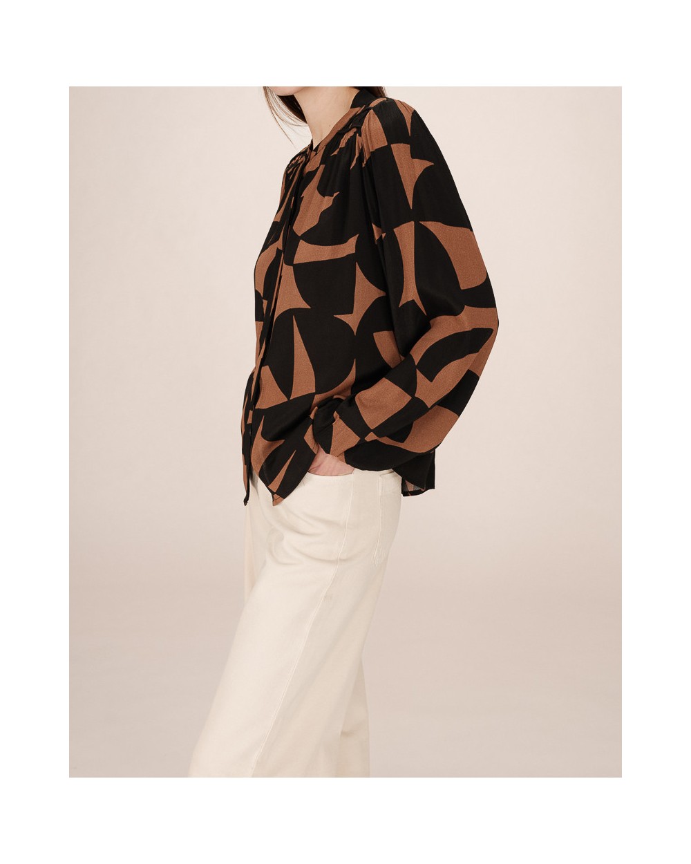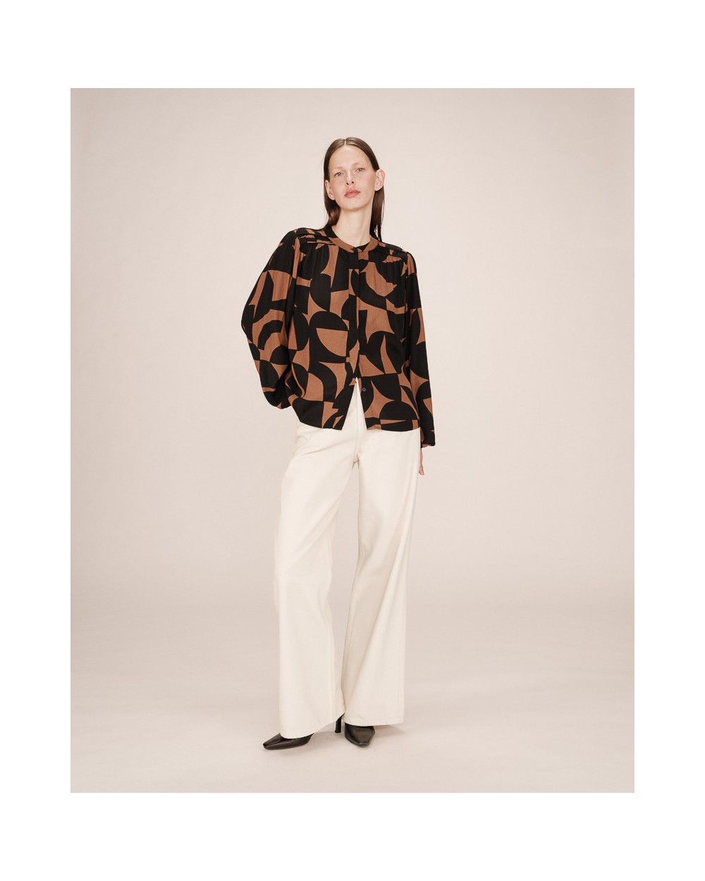 Camisa fluida, cierre con botones, mangas amplias, hombros plisados.