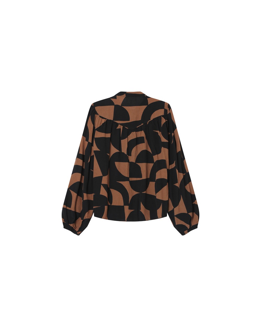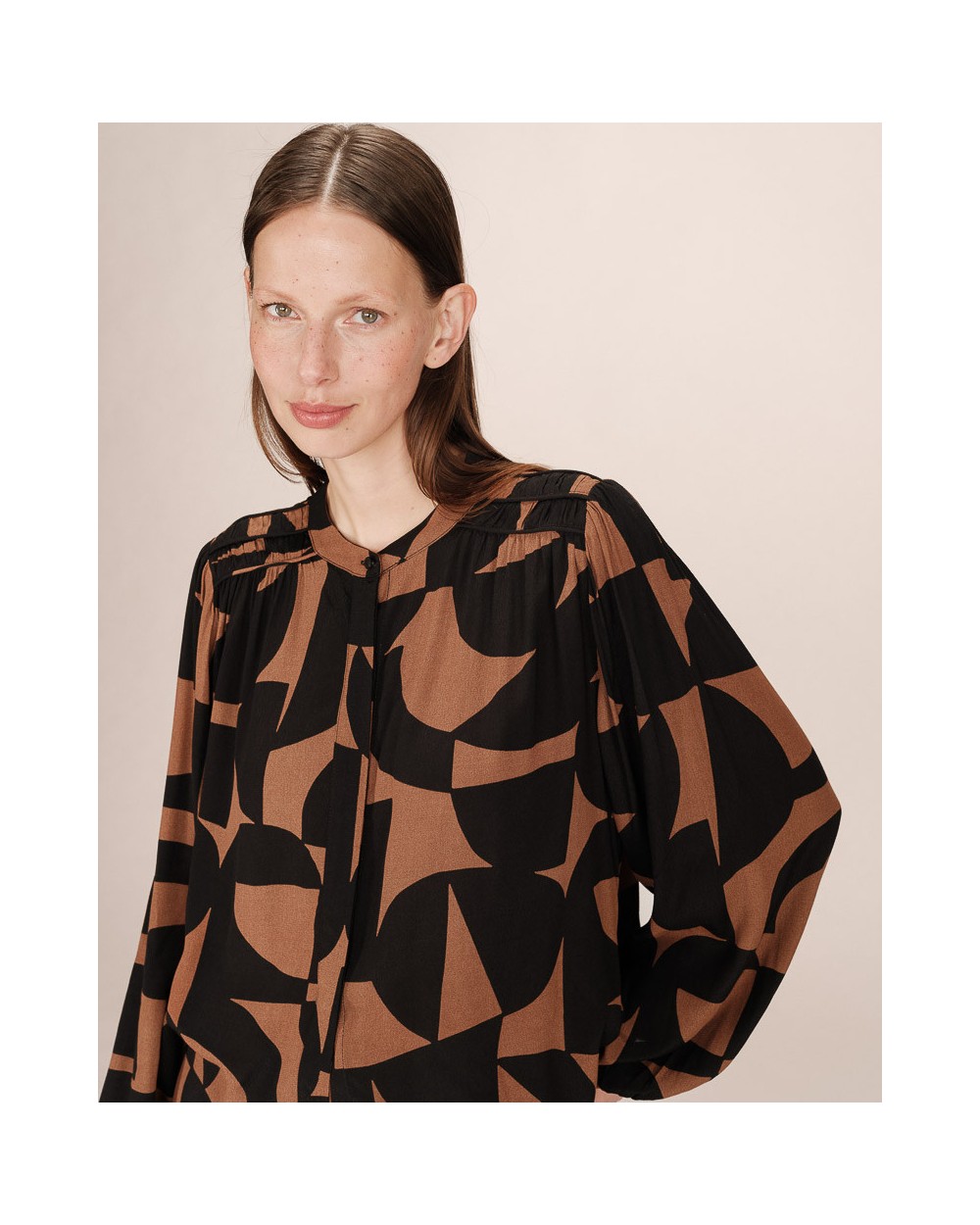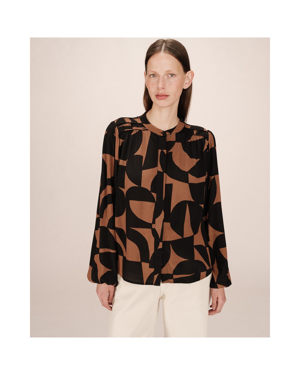 Camisa fluida, cierre con botones, mangas amplias, hombros plisados.