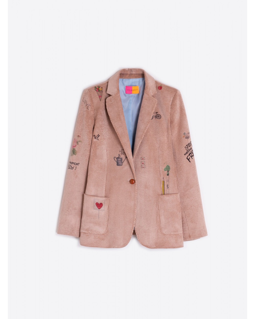 Chaqueta tipo americana de pana en tono nude, con estampado inspirado en el Parque madrileño de El Retiro, corte clàsico con cuello de solapa y cierre con botones delanteros, bolsillos laterales. Tejido elàstico para mayor comodidad.