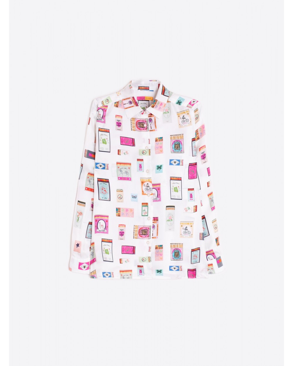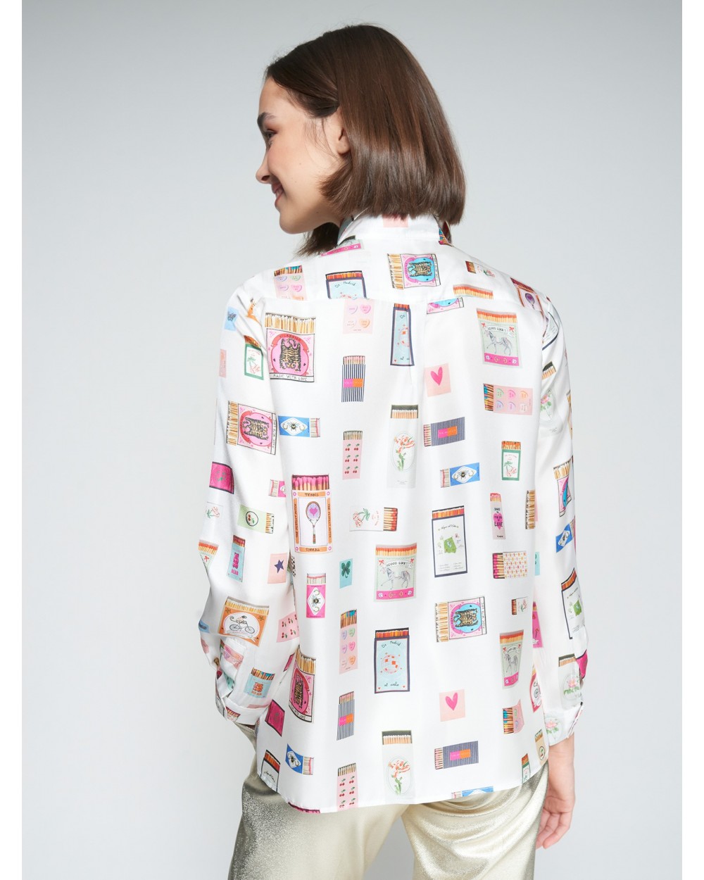 Camisa de seda 100% blanca con estampado multicolor de cajas de cerillas. Cuello camisero, corte recto, cierre frontal con botones, manga largas con puños abotonados.