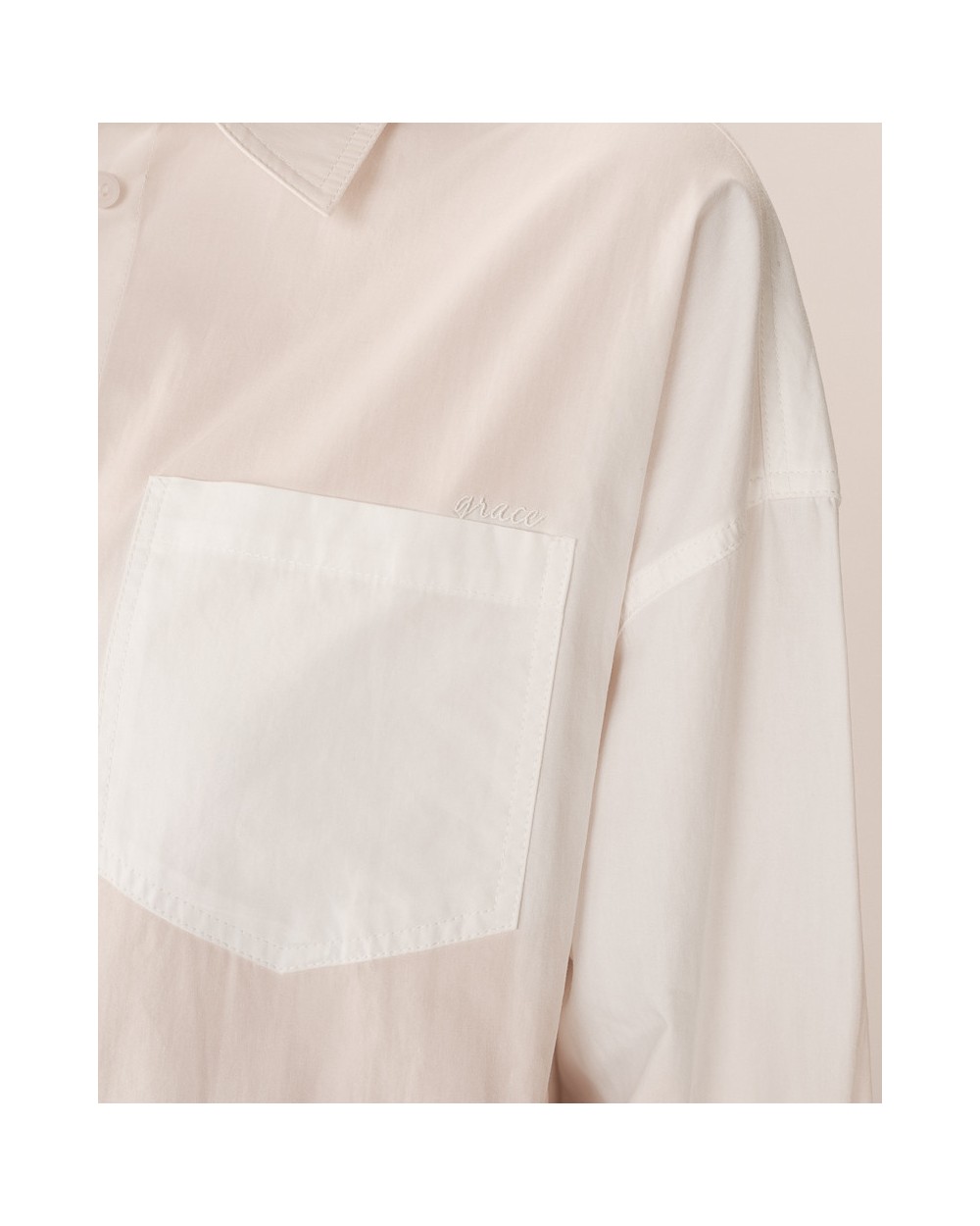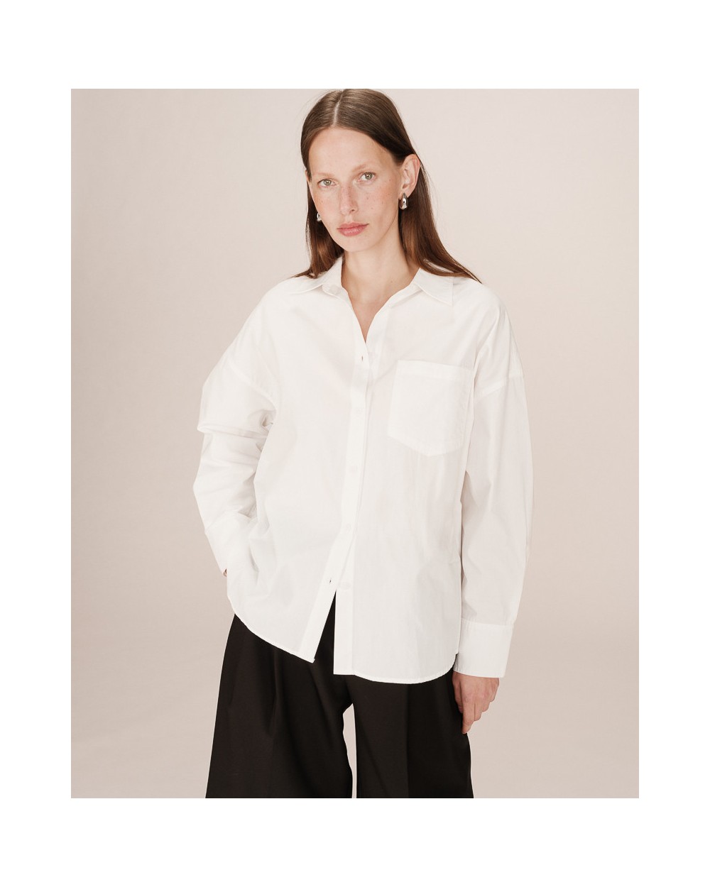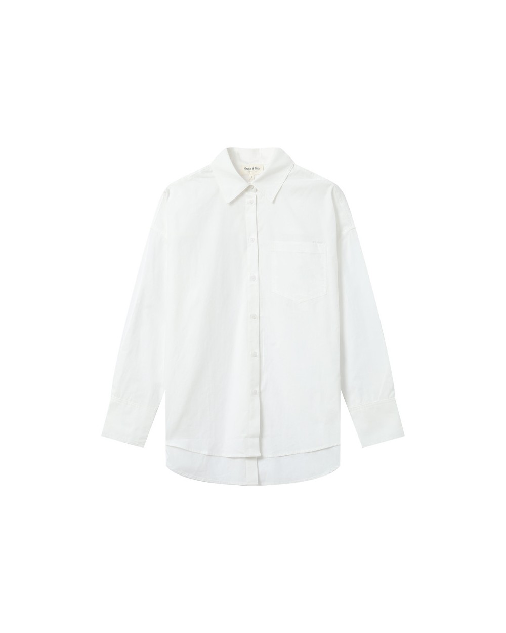 Camisa blanca oversize SIRA en algodón 100%, cierra con una tapeta de botones oculta en la parte posterior, ademàs está adornada con un exclusivo bordado "Grace" en el bolsillo, que da un toque de elegancia al modelo.