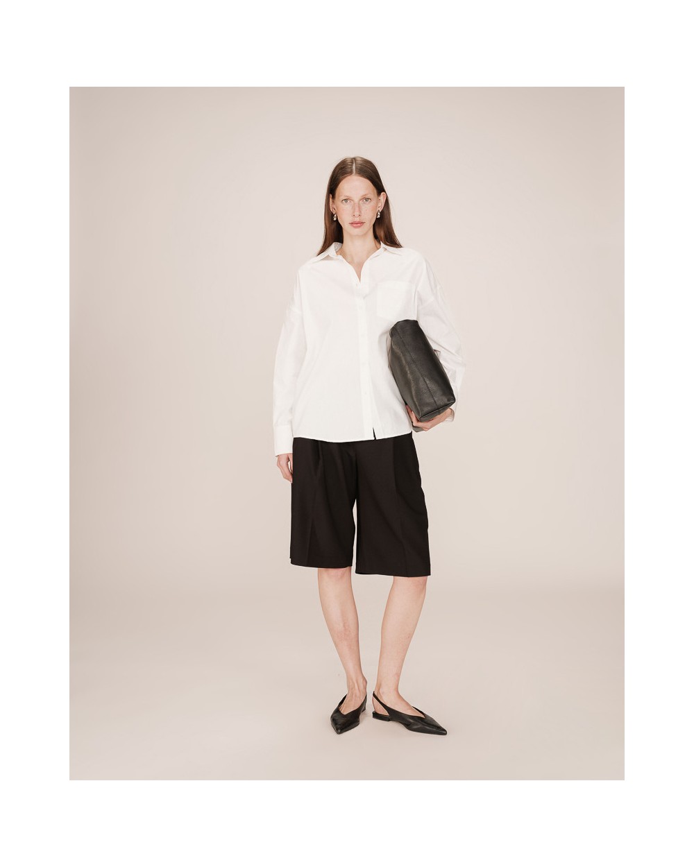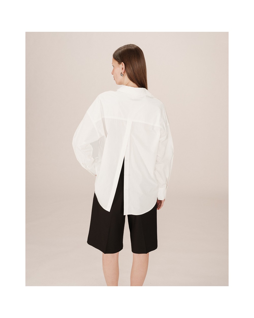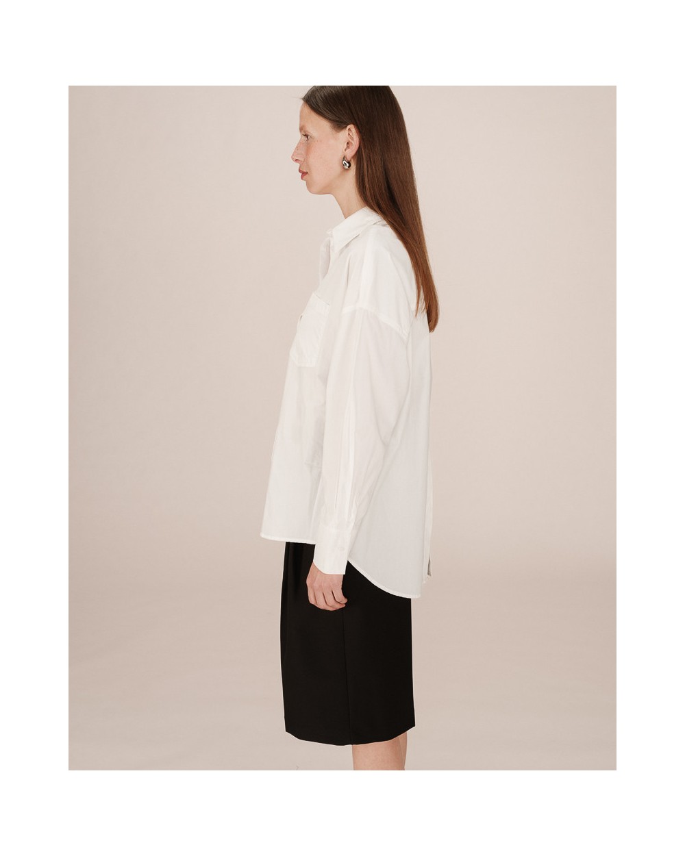 Camisa blanca oversize SIRA en algodón 100%, cierra con una tapeta de botones oculta en la parte posterior, ademàs está adornada con un exclusivo bordado "Grace" en el bolsillo, que da un toque de elegancia al modelo.