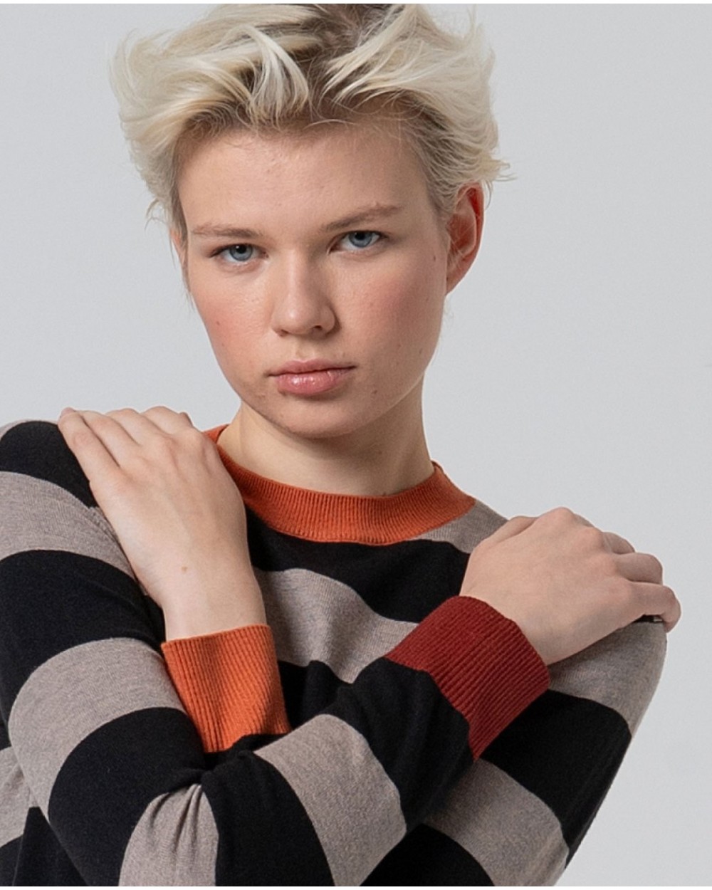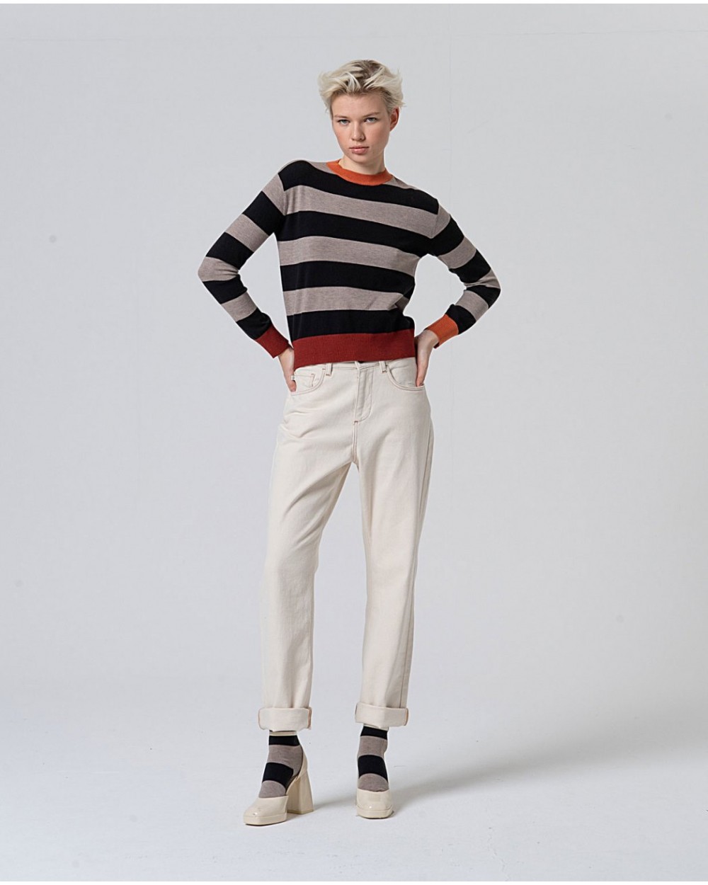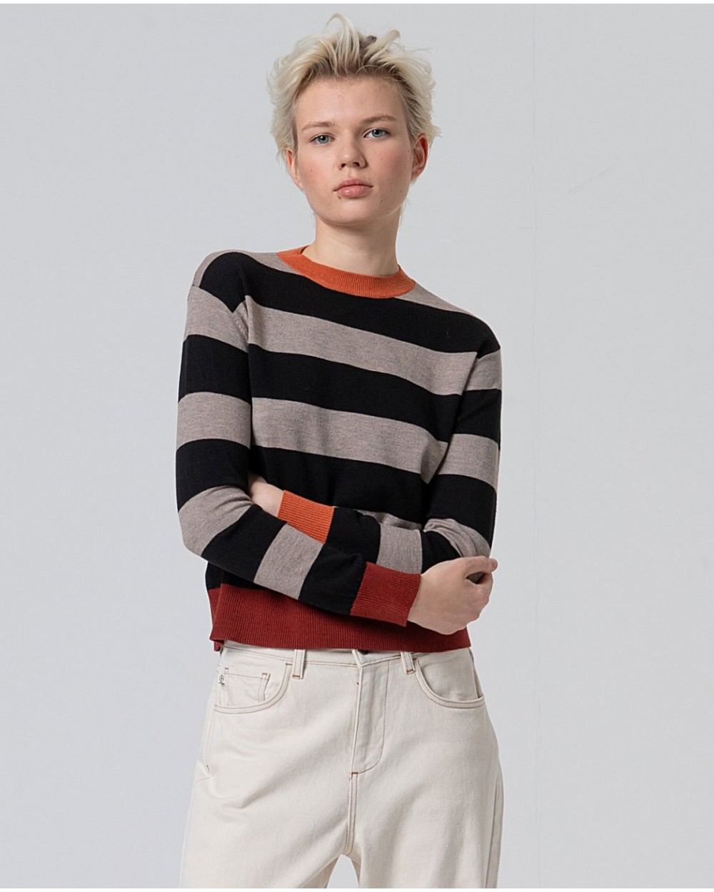 Jersey de rayas negro y gris con vivo en cuello, mangas y bajo en color caldero. Manga larga