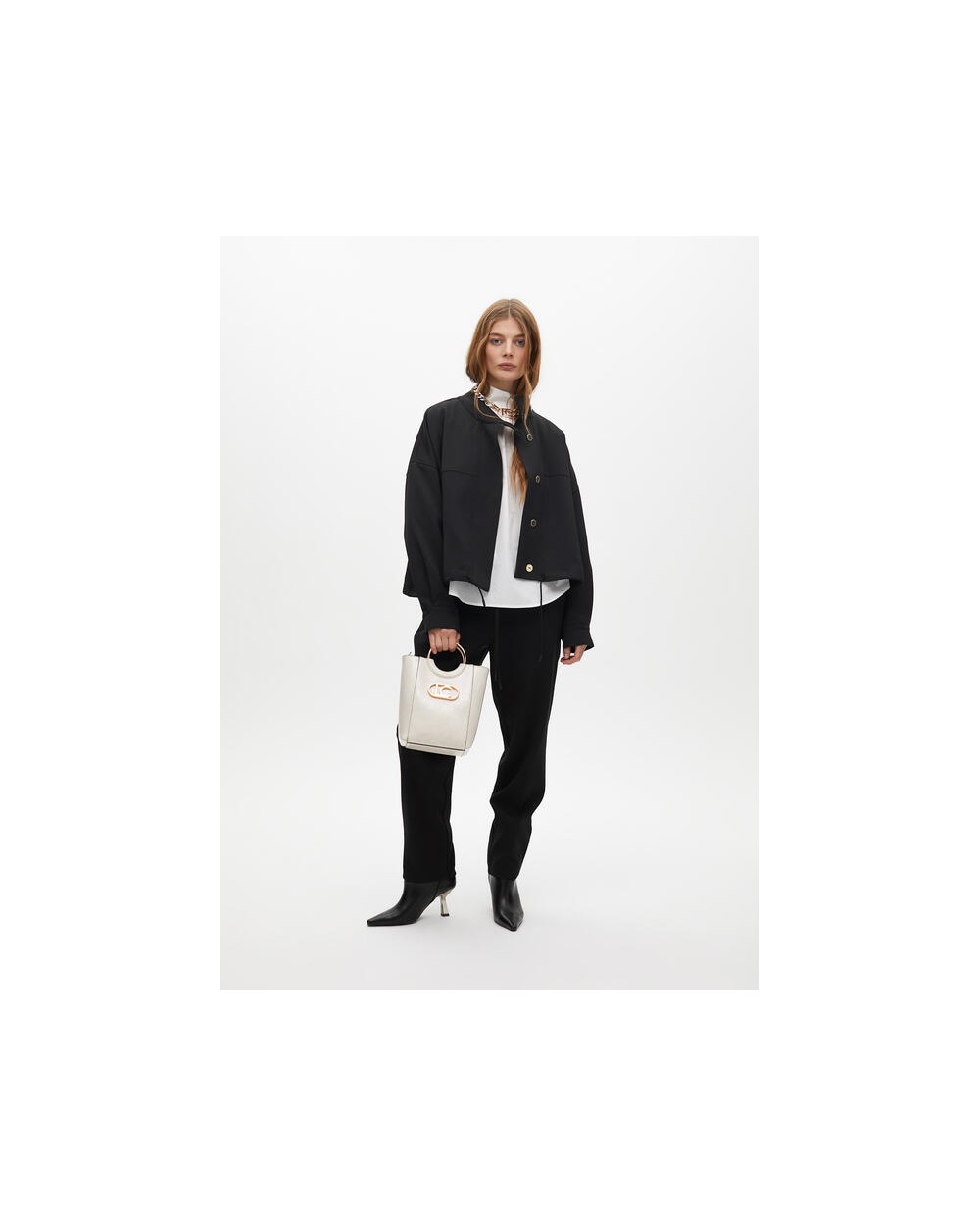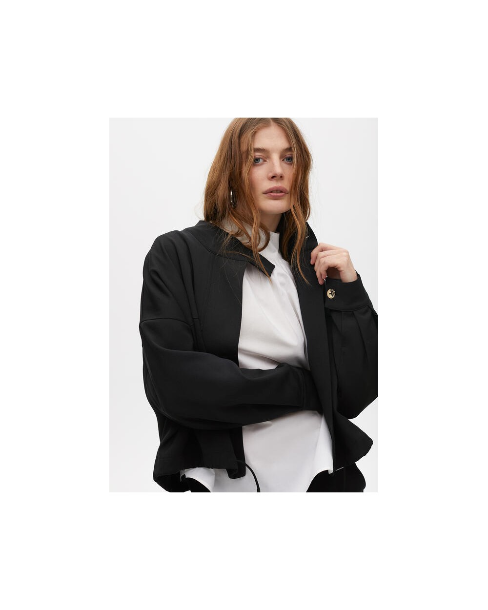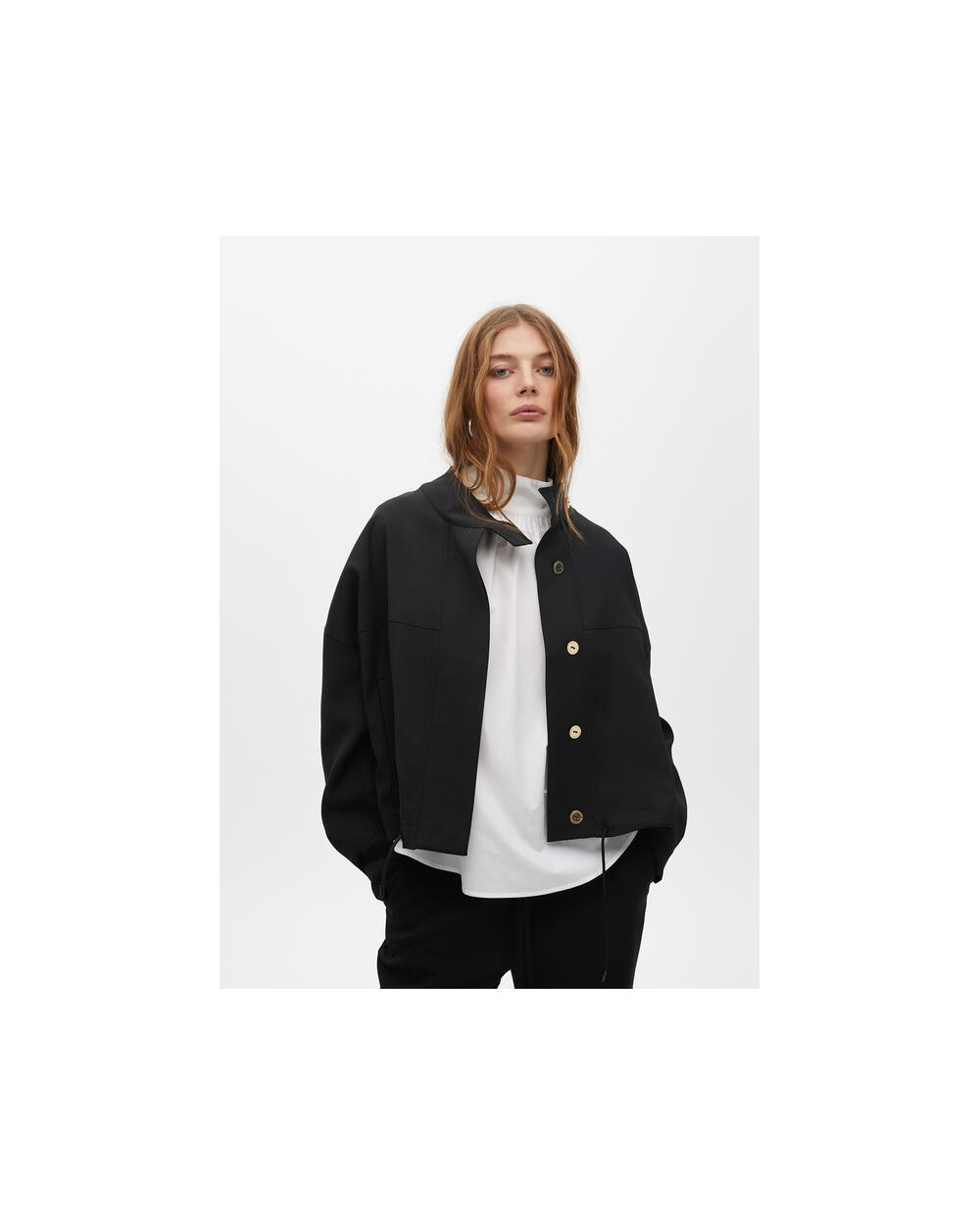 Chaqueta corta negra cintura ajustable, cierre con botones dorados con logo de Lola Casademunt.