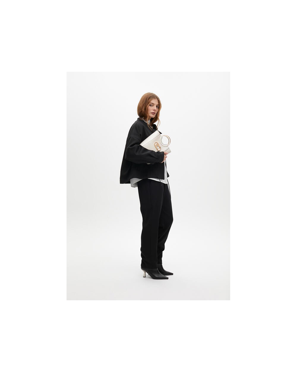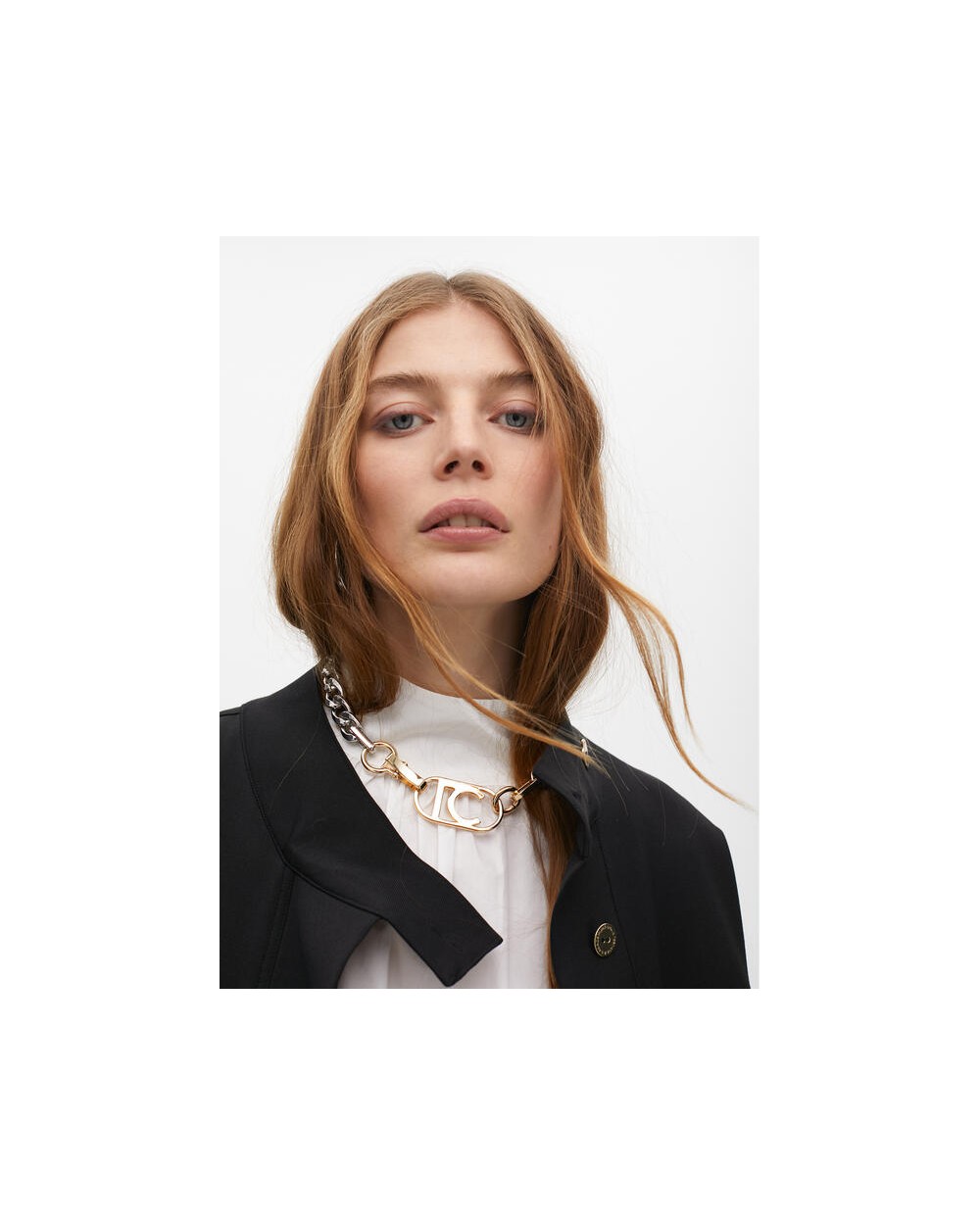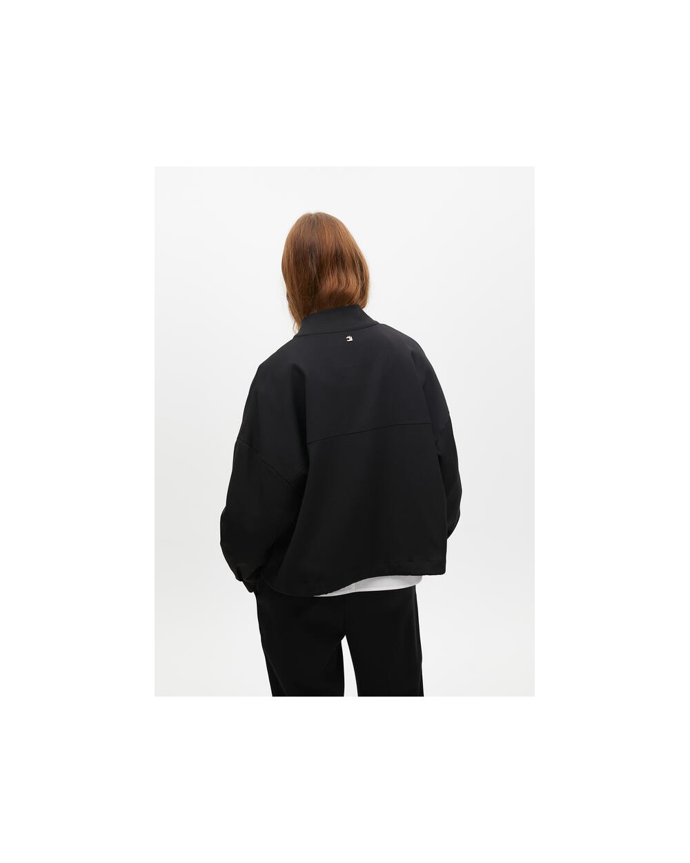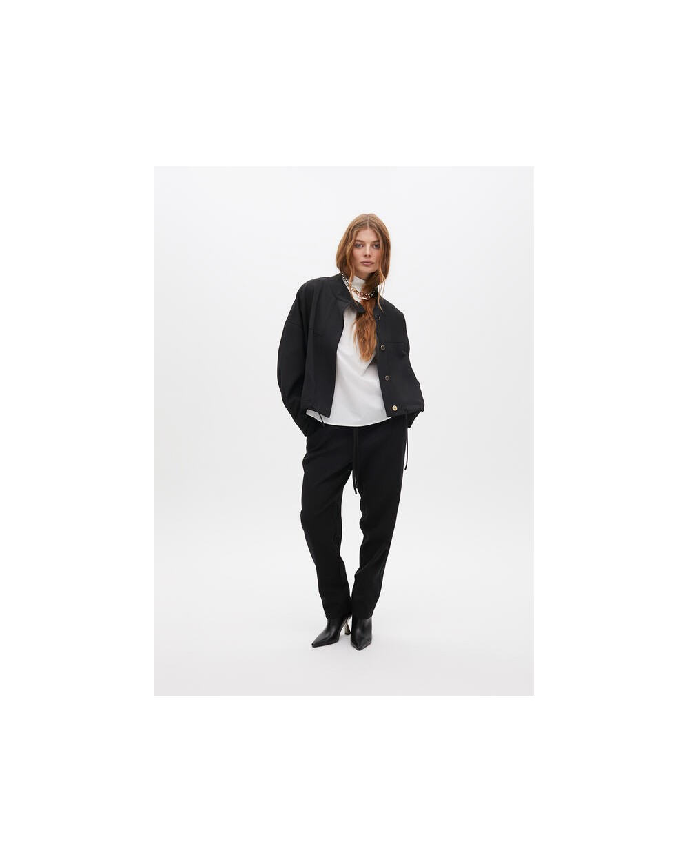 Chaqueta corta negra cintura ajustable, cierre con botones dorados con logo de Lola Casademunt.