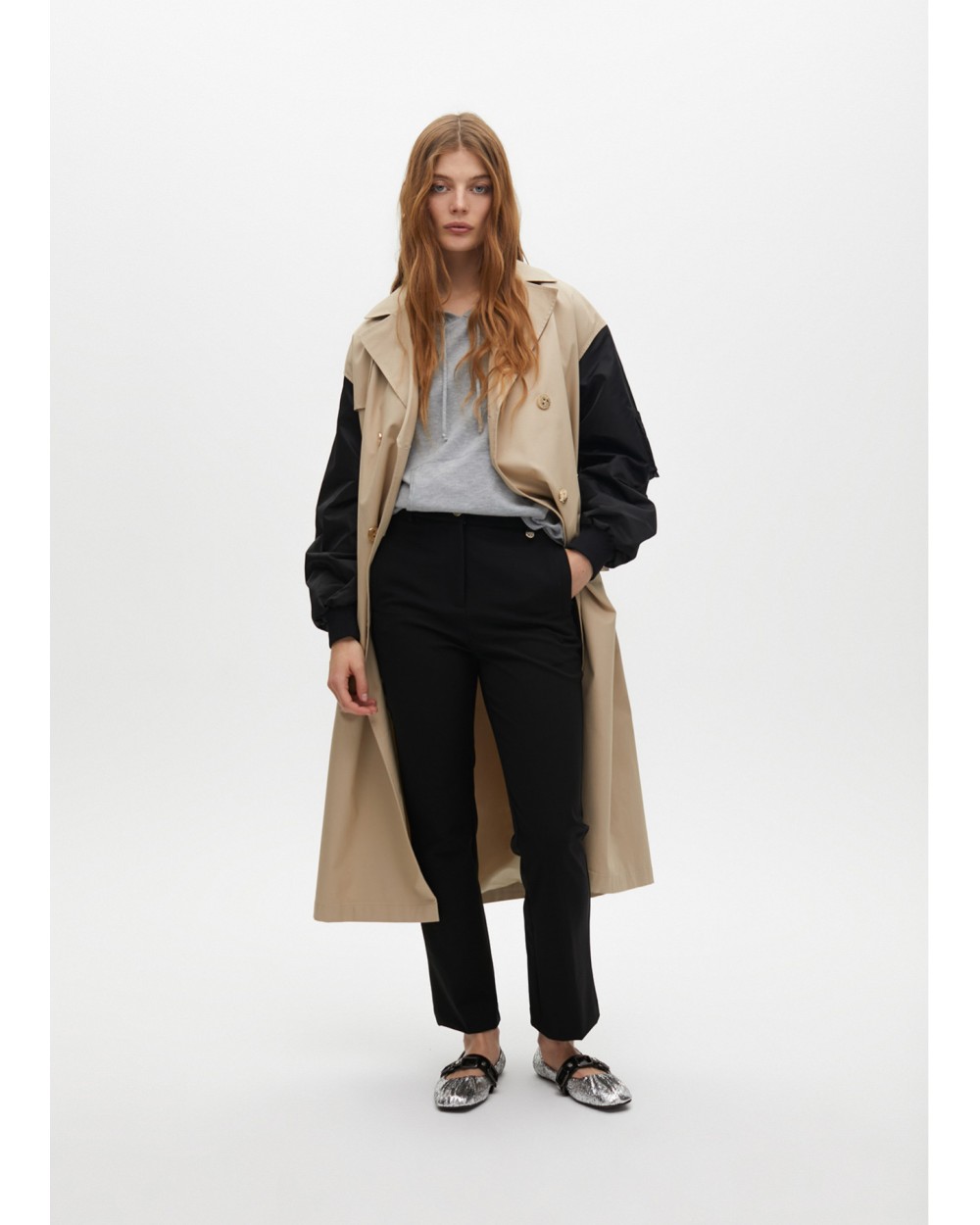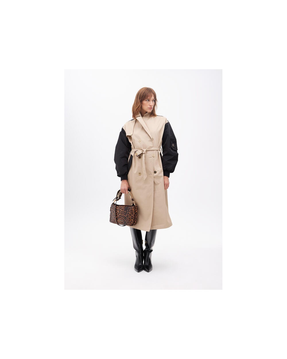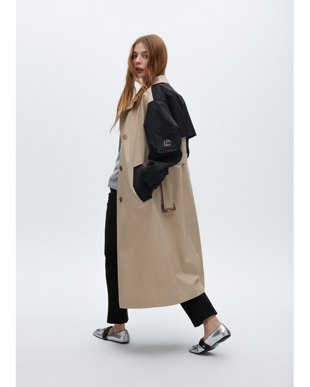 Gabardina clàsica en tono camel con toque de mangas en color negro, detalles de botones dorados y cinturòn ajustable.