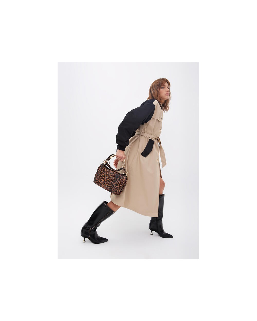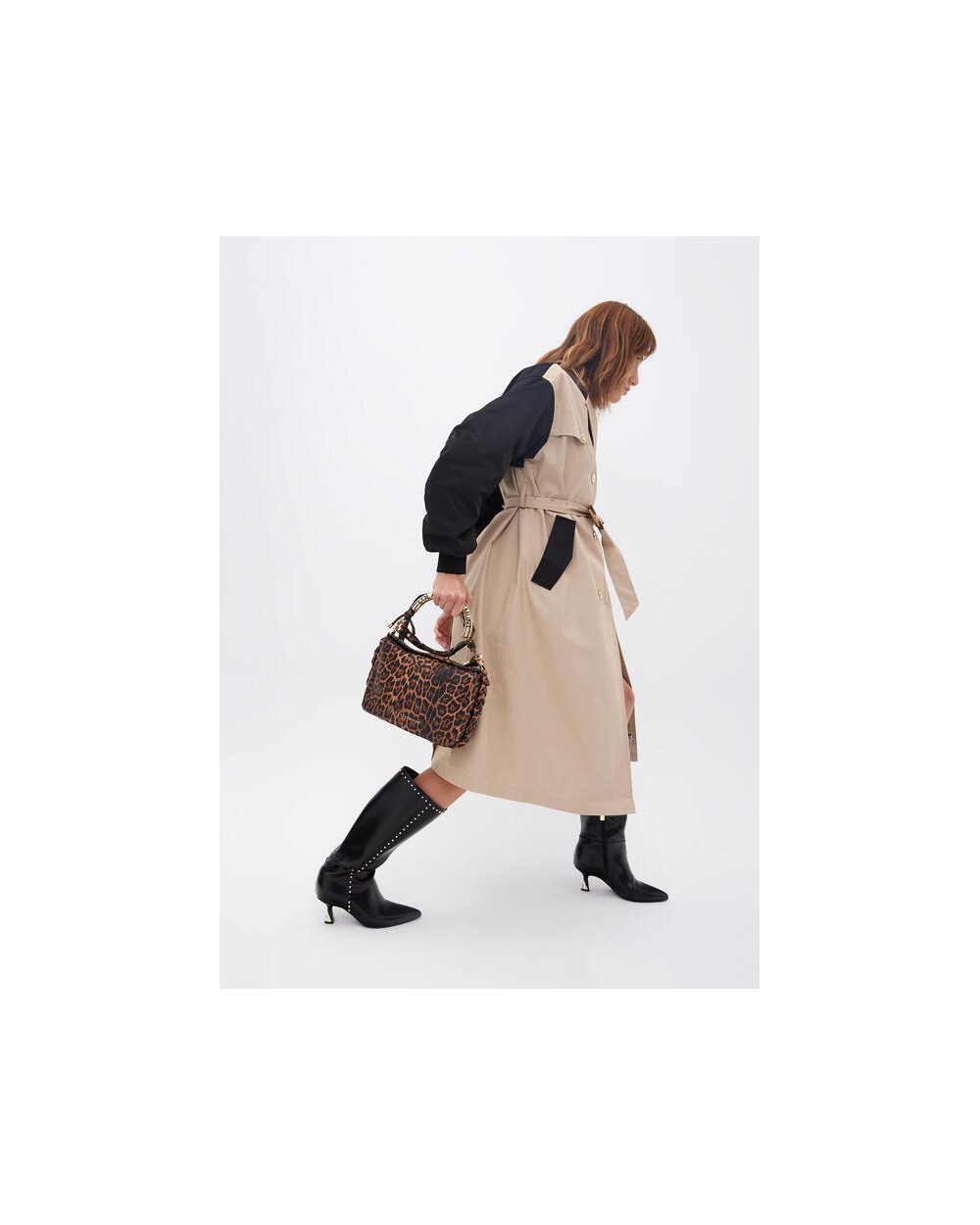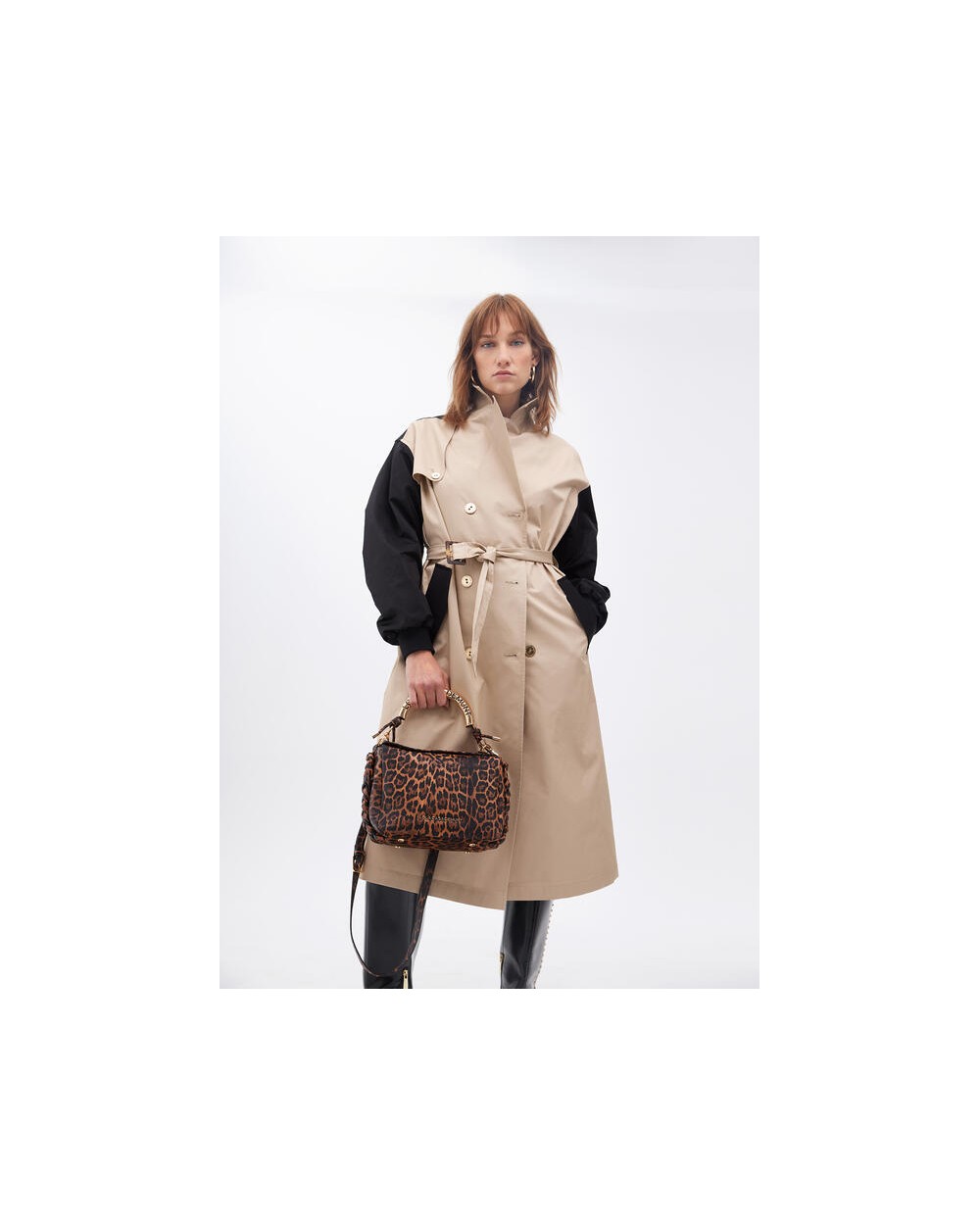 Gabardina clàsica en tono camel con toque de mangas en color negro, detalles de botones dorados y cinturòn ajustable.