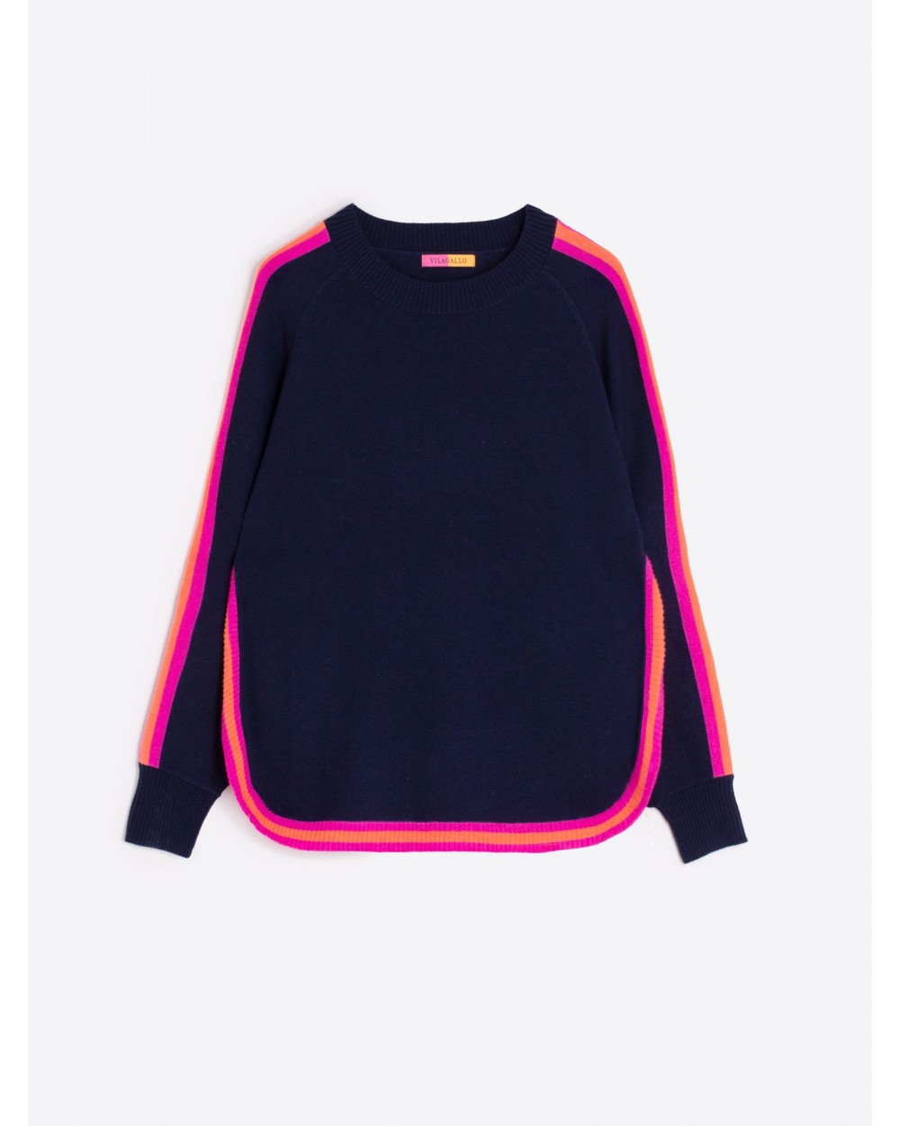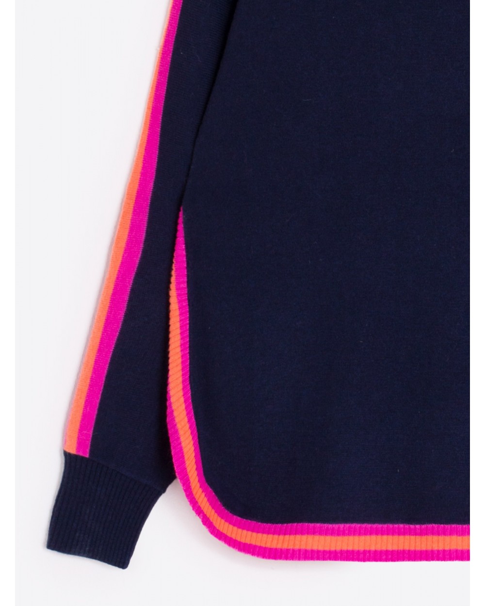 Jersey con escote redondo azul marino con ribetes en tonos flùor. Escote redondo y mangas ranglàn. Vivos en tonos fucsia y naranja en los laterales y el bajo, que tiene forma redondeada El tejido es suave y cálido, con mezcla de lana. Corte recto.