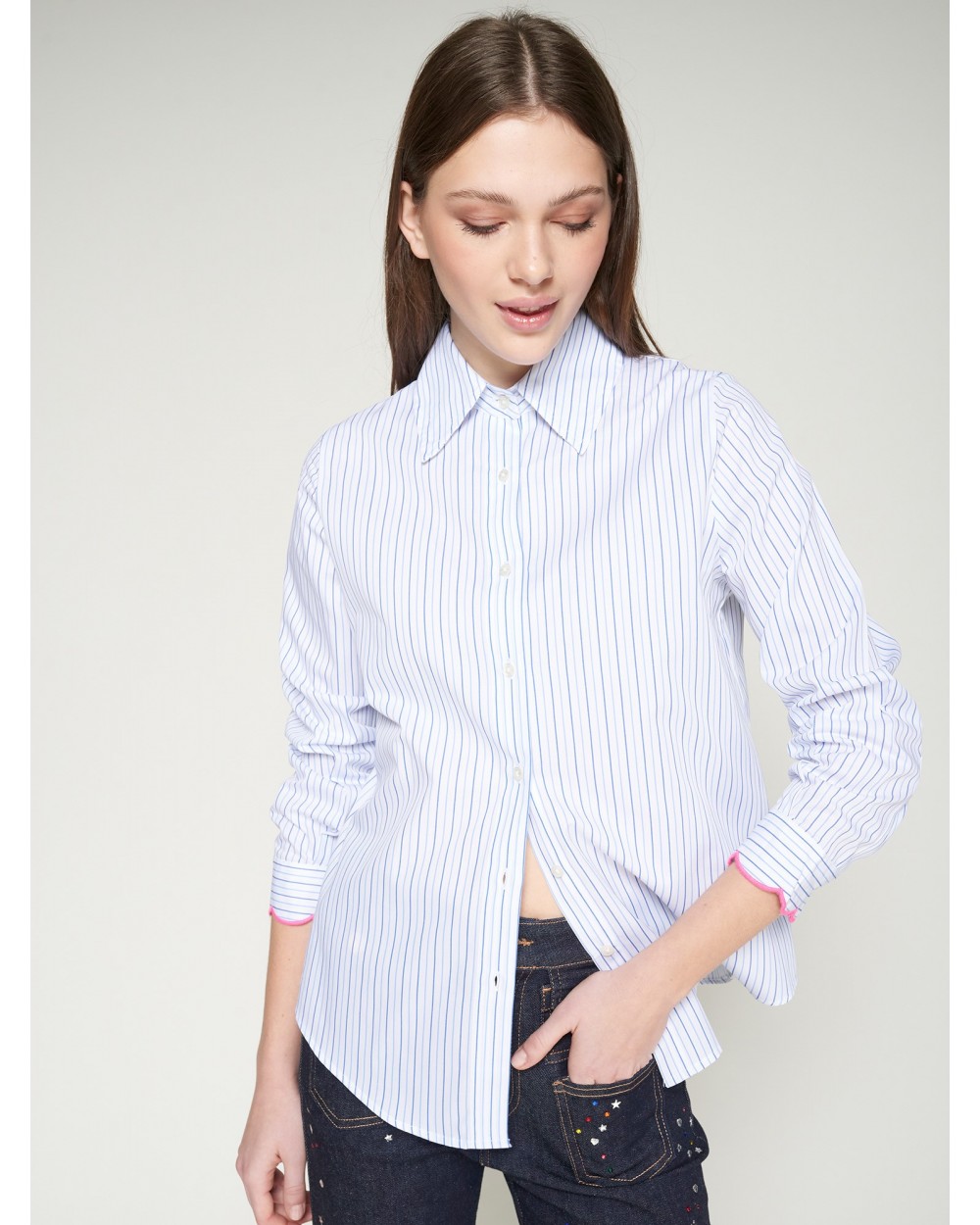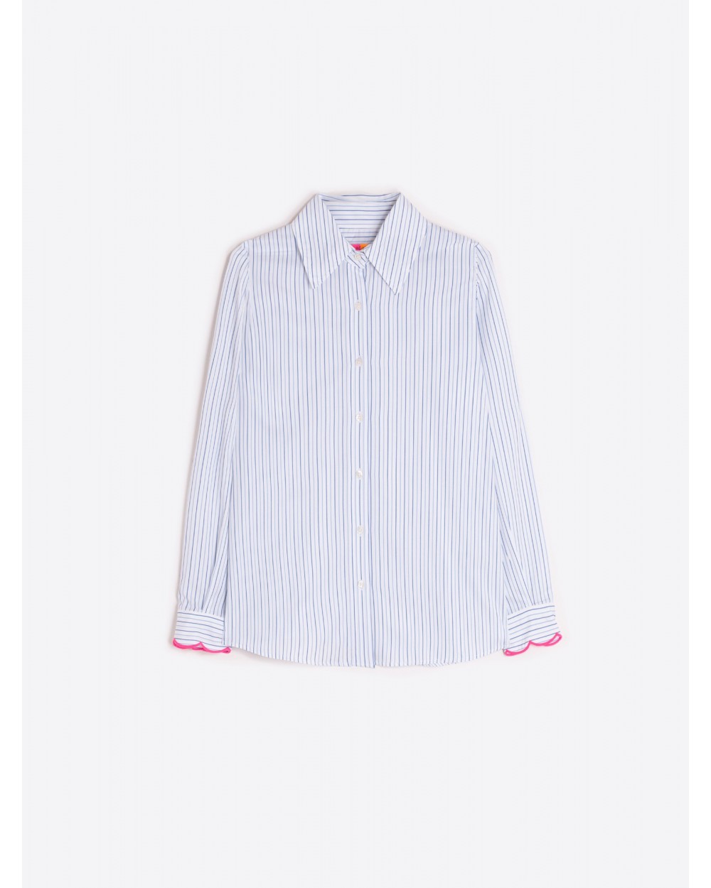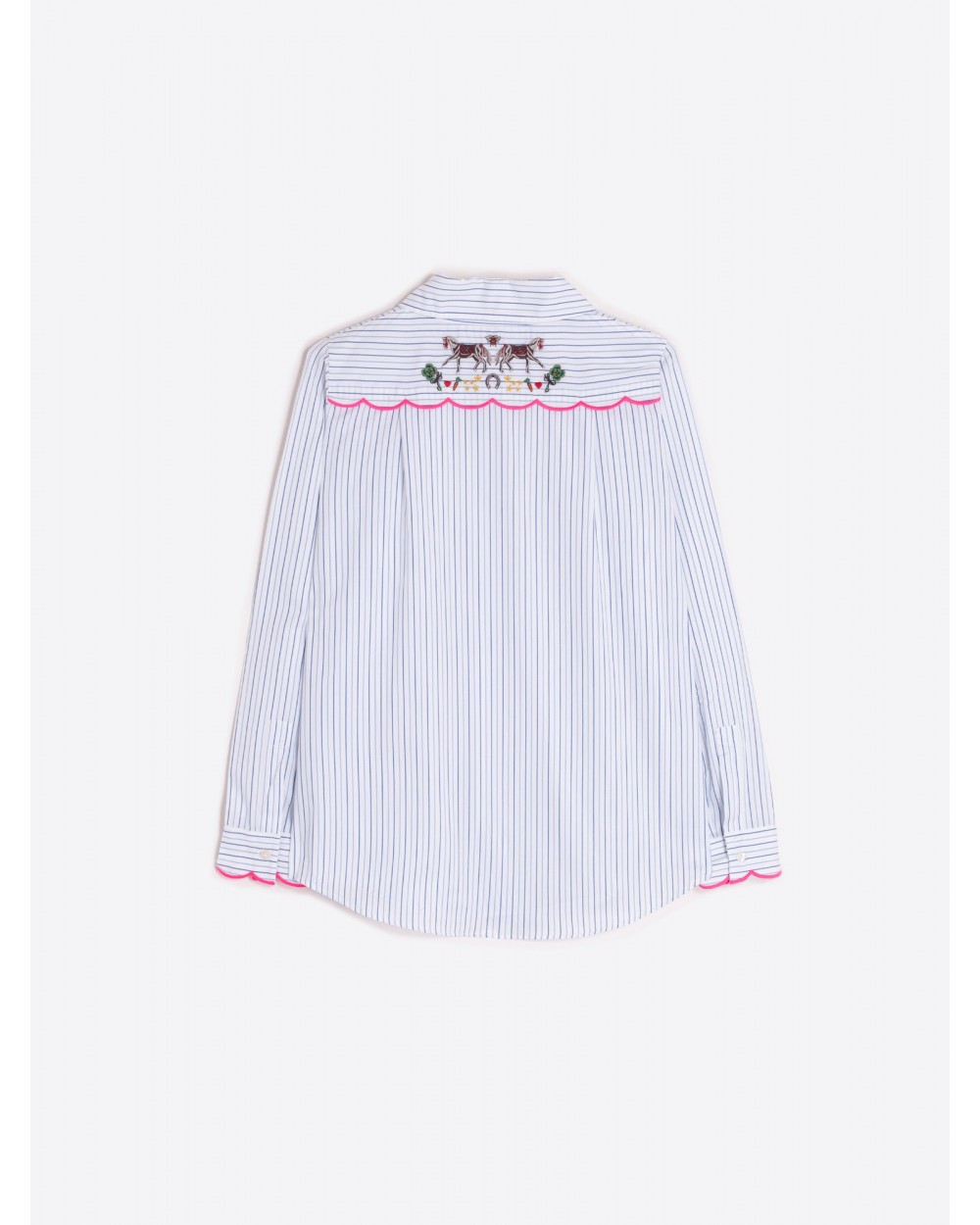 Camisa de rayas celeste con cuello clásico y cierre frontal de botones visibles. En la parte trasera lleva un bordado con caballos, árboles, herraduras y pequeños detalles decorativos. El canesú trasero está rematado con una onda rosa, igual que el bajo de los puños. Tejido de algodón estructurado de grosor medio.