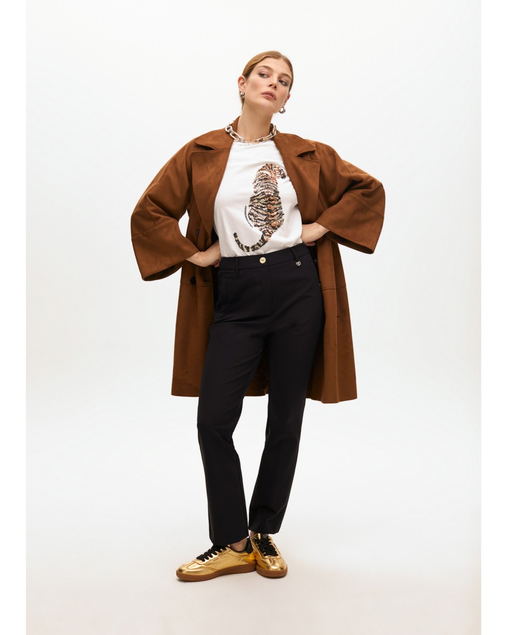 Camiseta con motivo de tigre en lentejuelas, diponible en blanco y negro. Corte recto y cuello redondo.