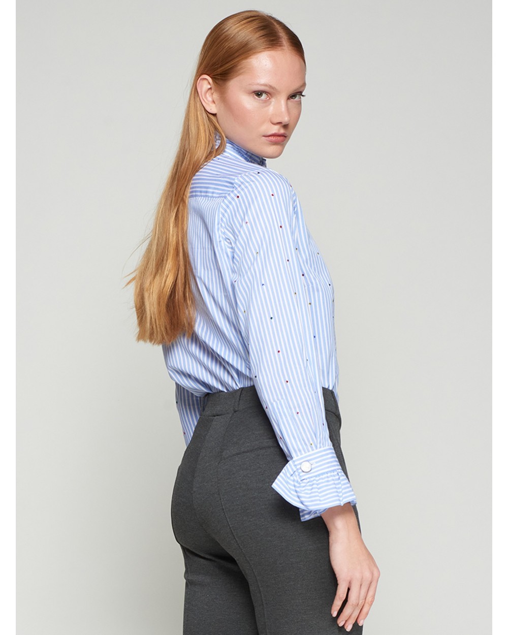 Camisa de rayas finas celestes con strass multicolor distribuidos sobre el tejido. Diseño exclusivo con cuello subido ligeramente fruncido. Manga larga con puño ancho y detalle de volante plisado. Cierre frontal con botones visibles. Tejido estructurado 100% algodón.