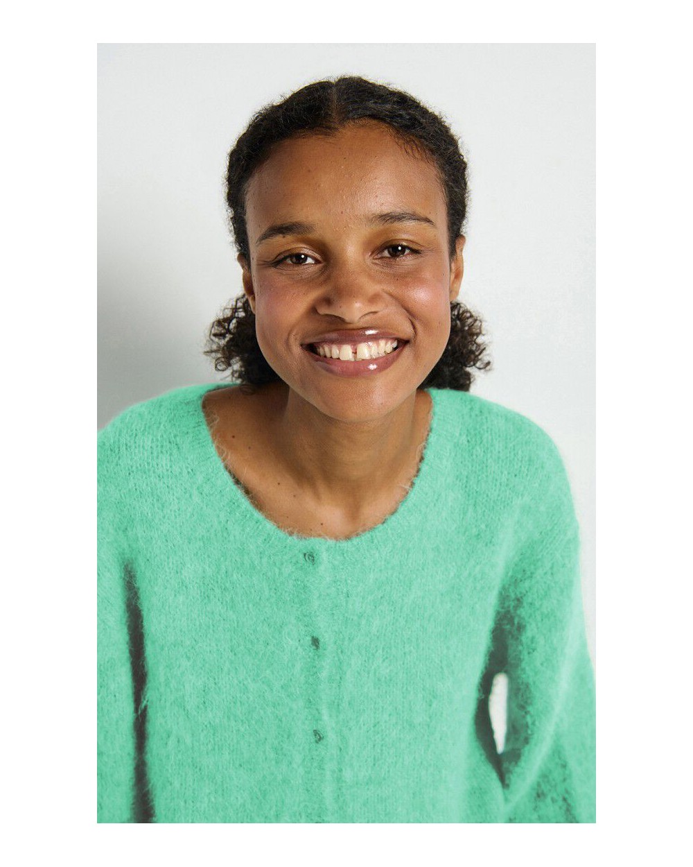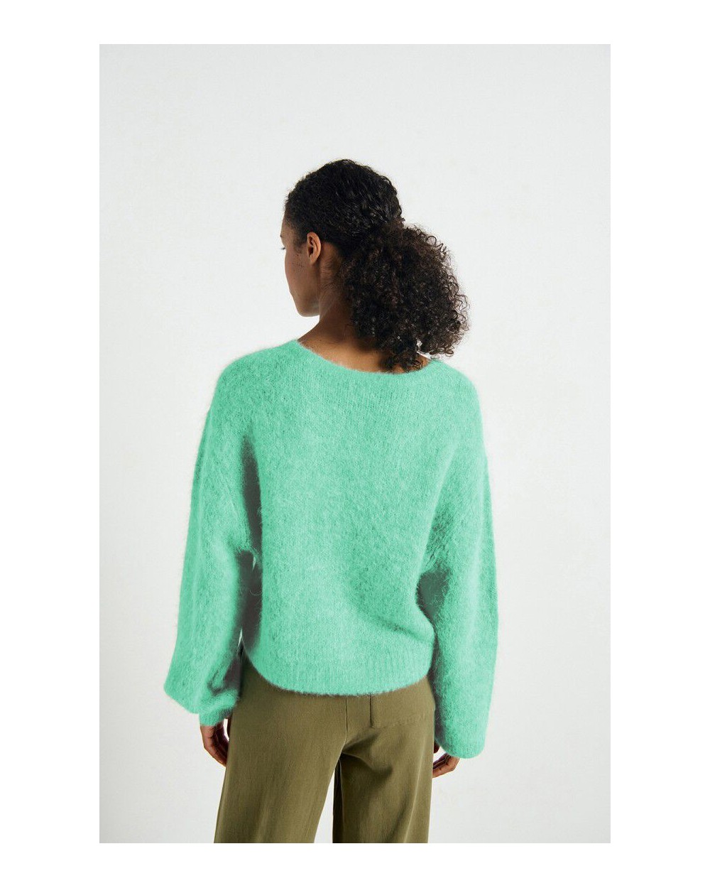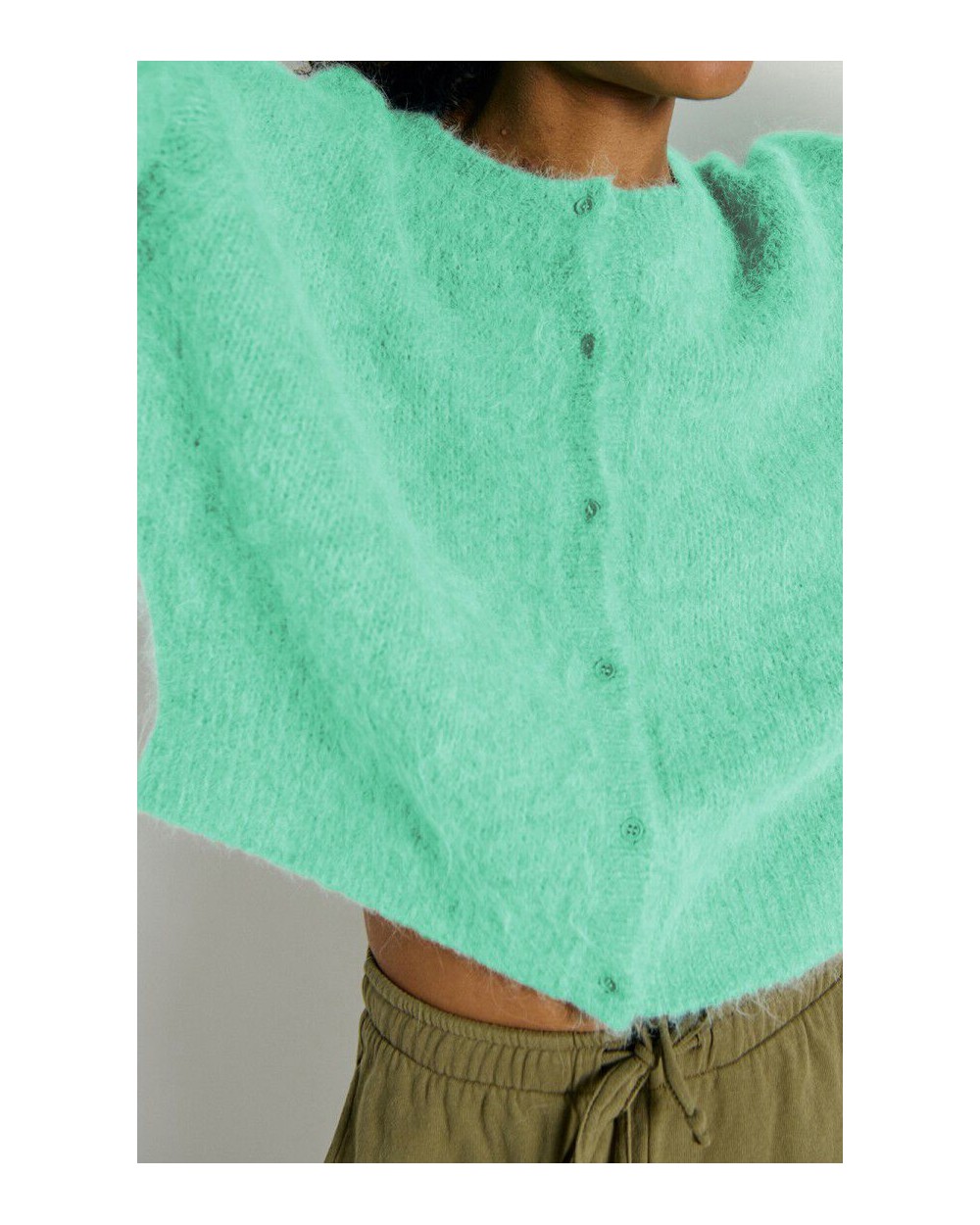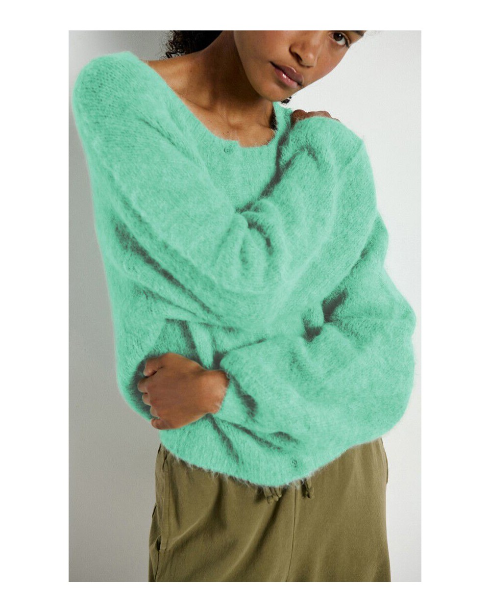 Chaqueta en color verde menta, con lana de alpaca, cierre con botones delanteros.