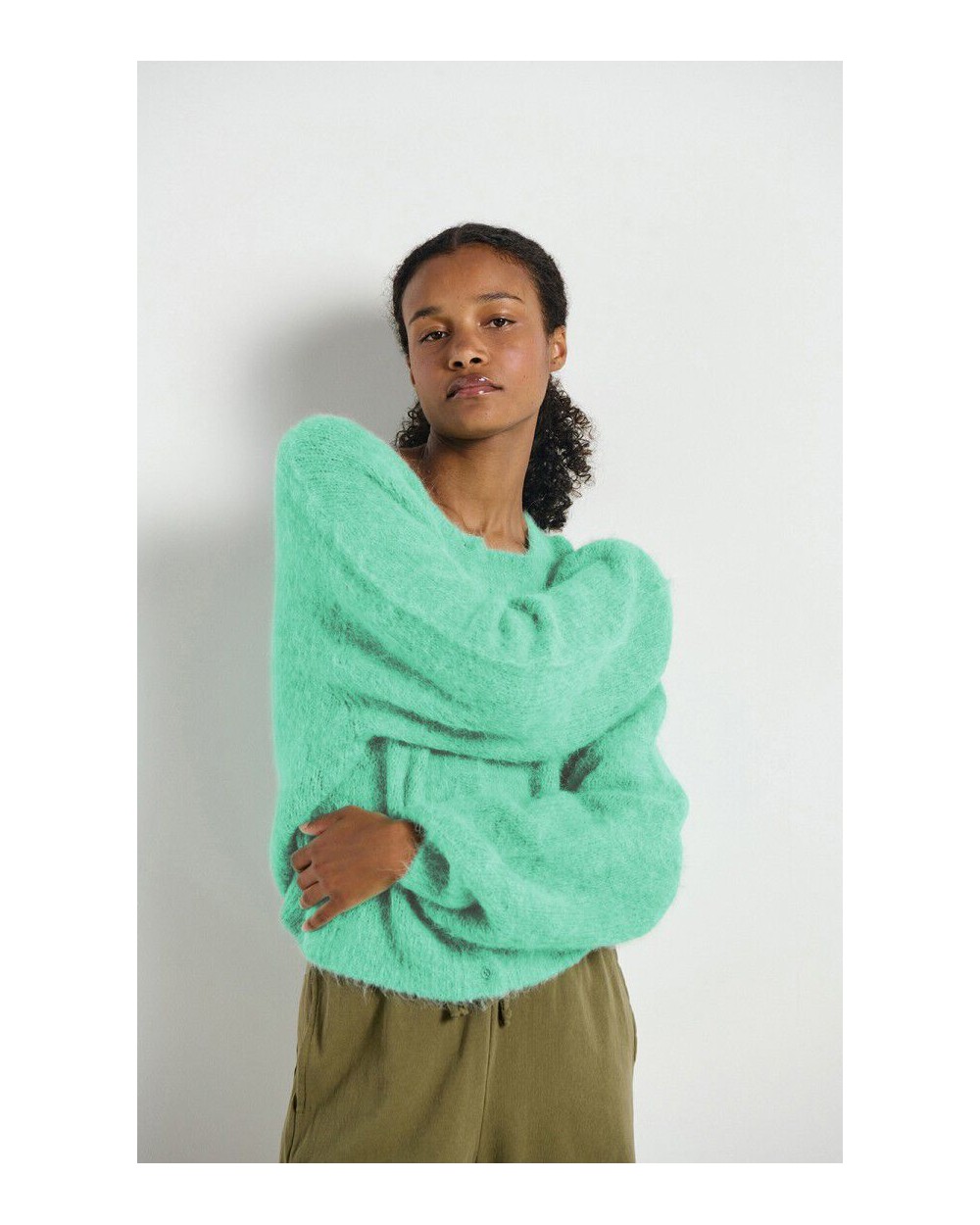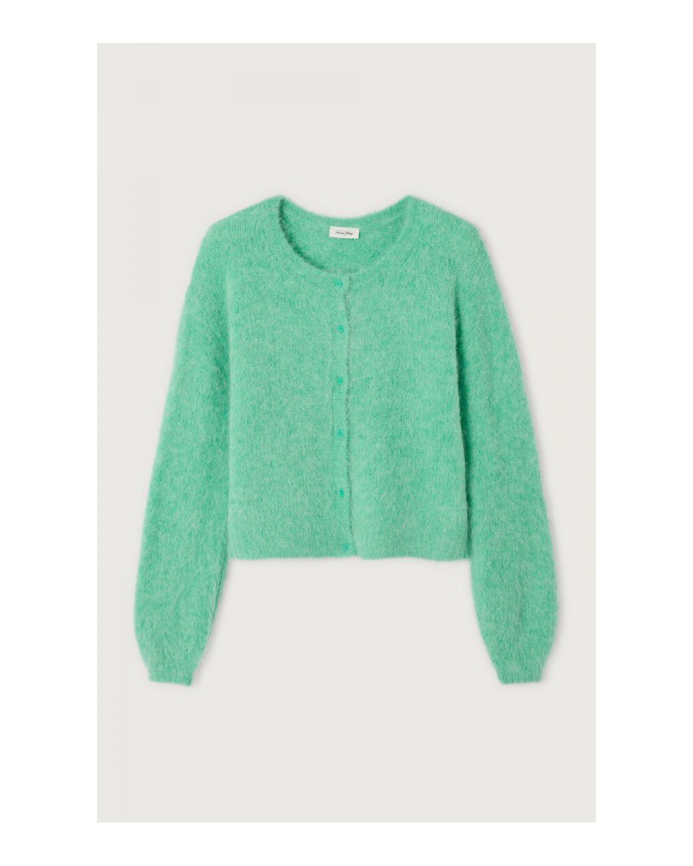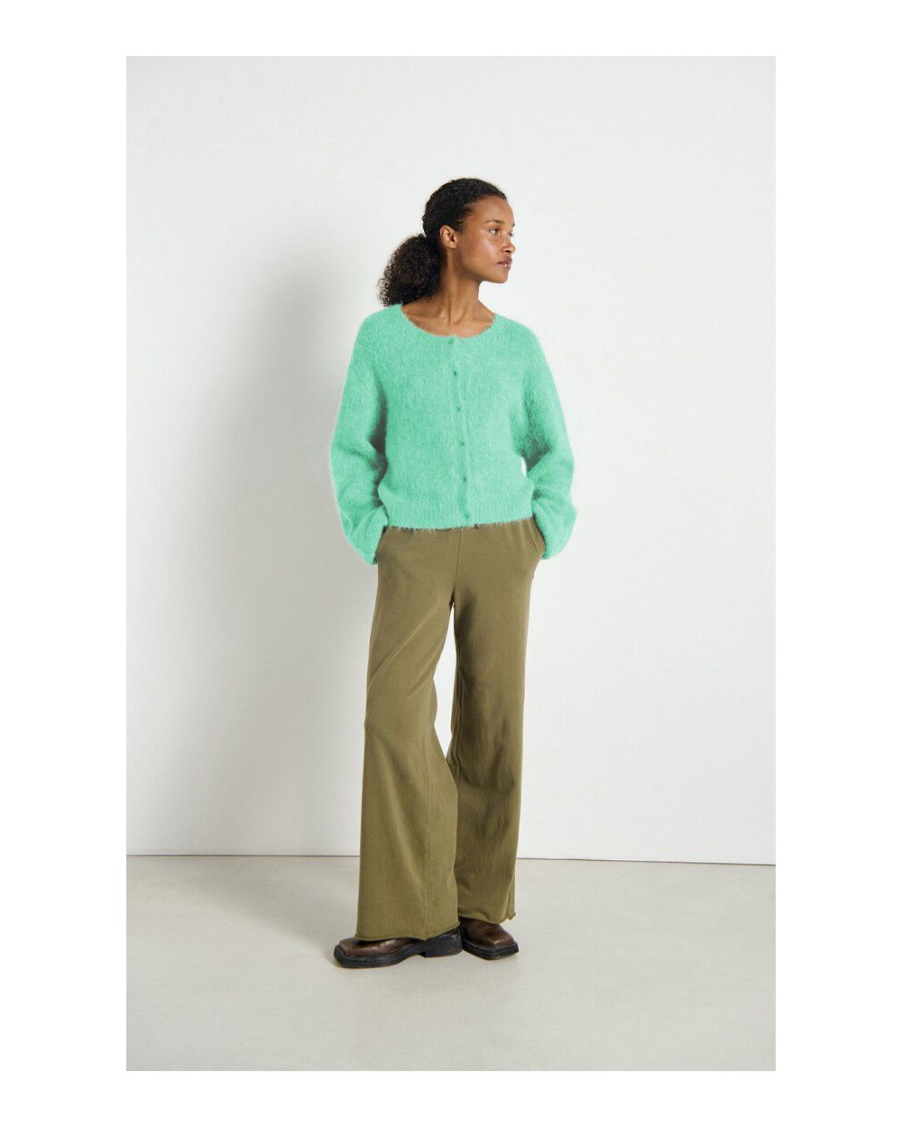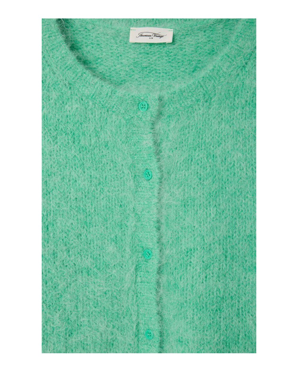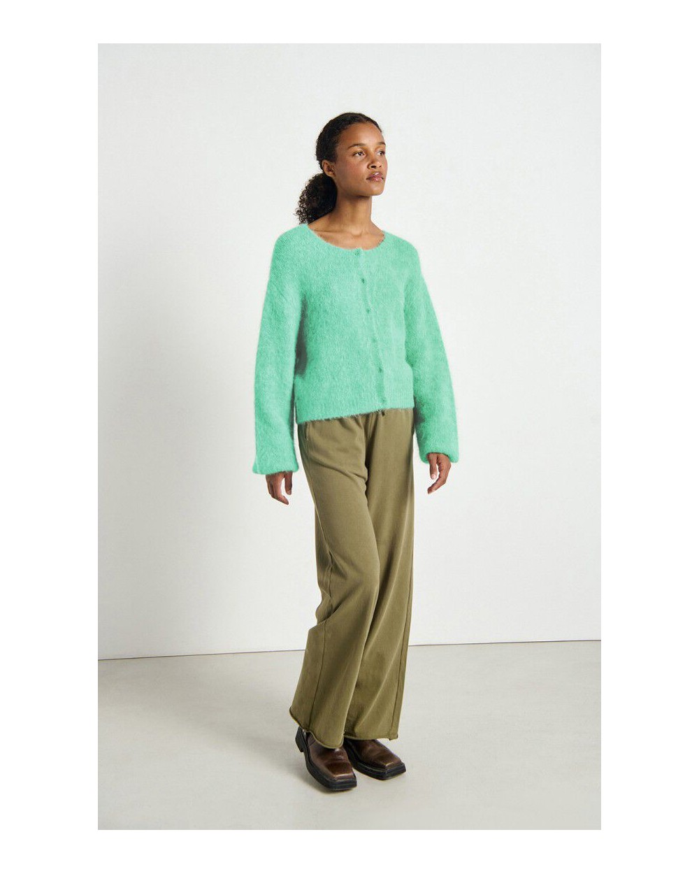 Chaqueta en color verde menta, con lana de alpaca, cierre con botones delanteros.