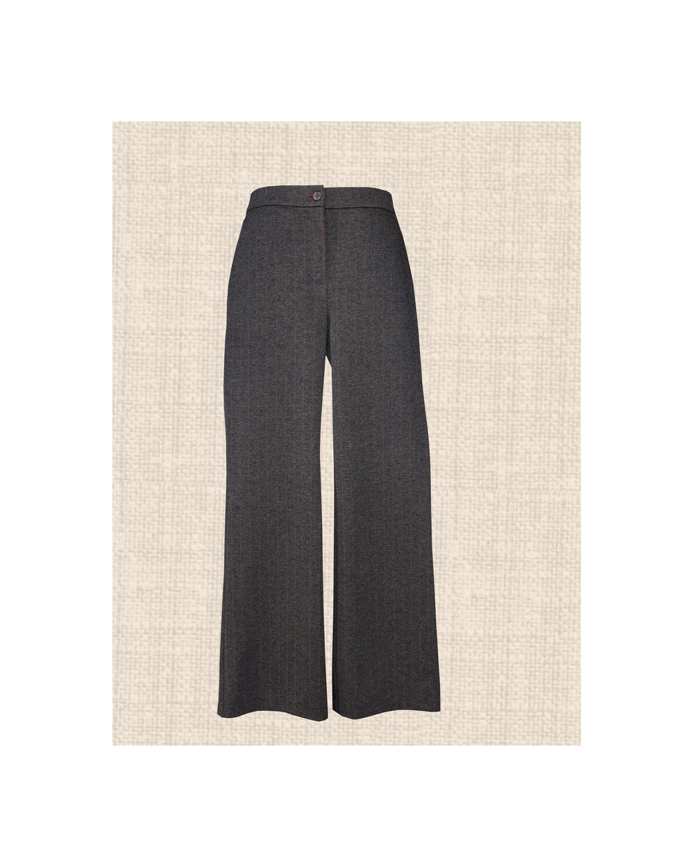 Pantalón de punto roma con bolsillos roma confeccionado en un tejido suave, flexible y de excelente caída, es ideal para acompañarte desde la oficina hasta un look urbano de fin de semana, sin renunciar al estilo. En color gris con lìneas en color burdeos.
