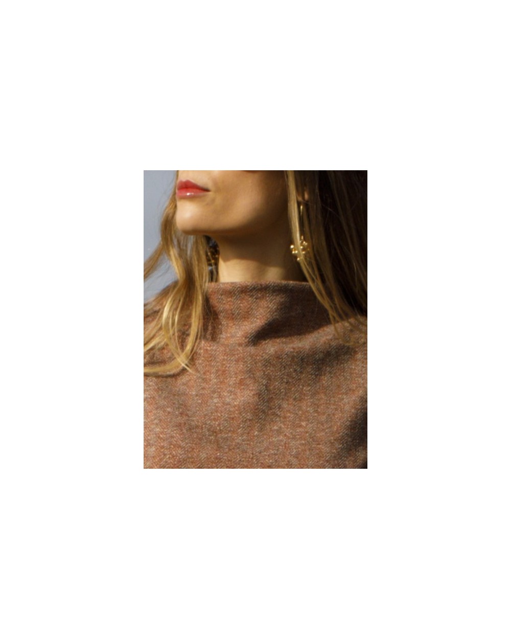 Jersey de punto fino en color marrón tostado con un ligero jaspeado, ideal para entretiempo y días frescos. Su diseño con cuello chimenea estiliza el cuello con un toque moderno y elegante. Las mangas largas terminadas en puño engomado aportan comodidad y un ajuste perfecto, mientras que el bajo engomado ajustable permite adaptarlo a la silueta, logrando un look más entallado o relajado según la ocasión.