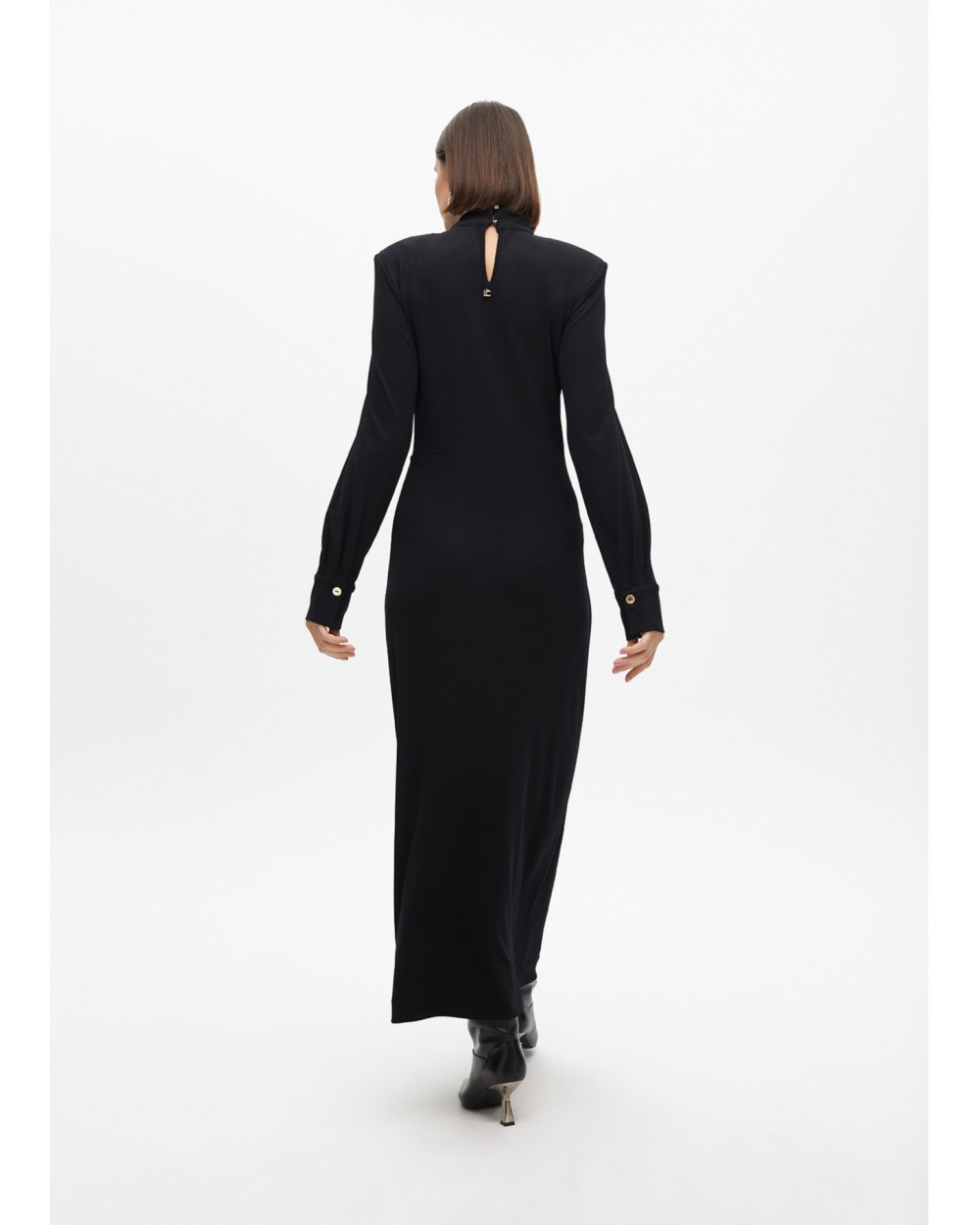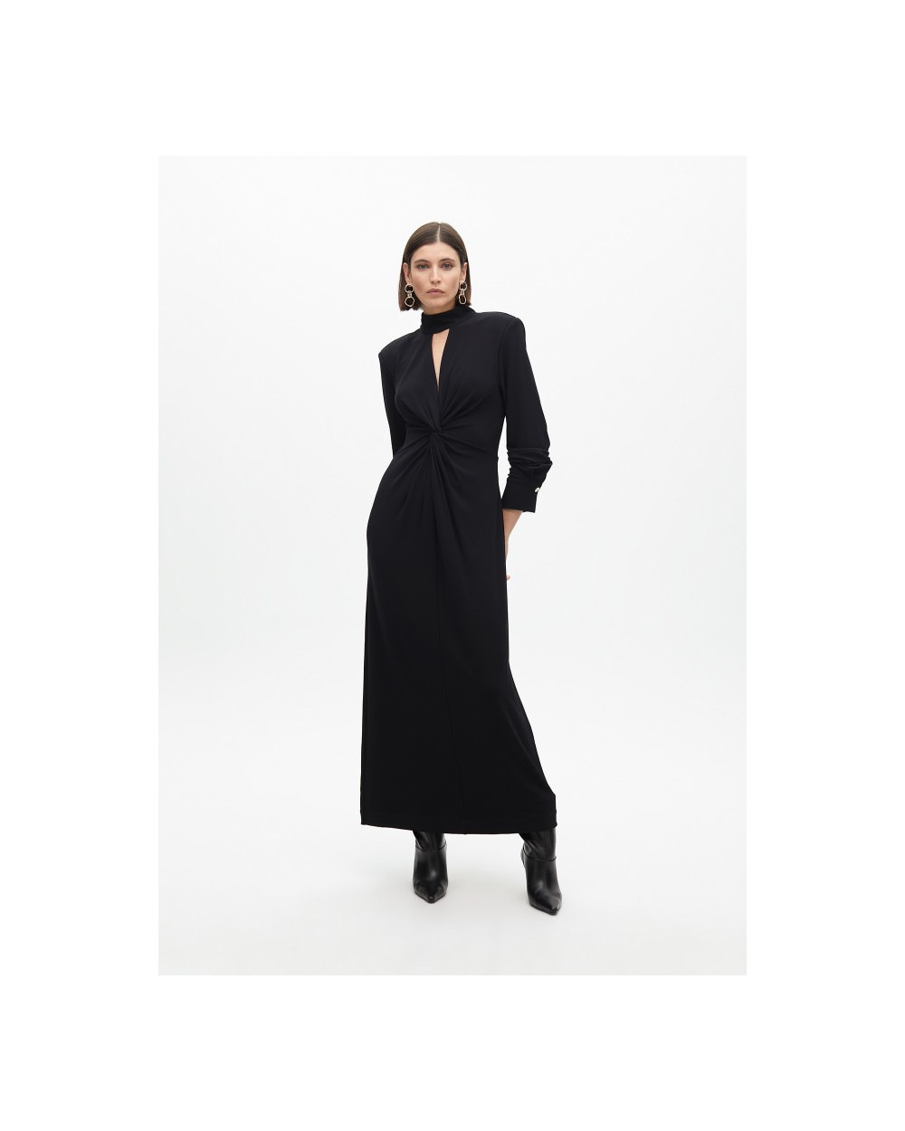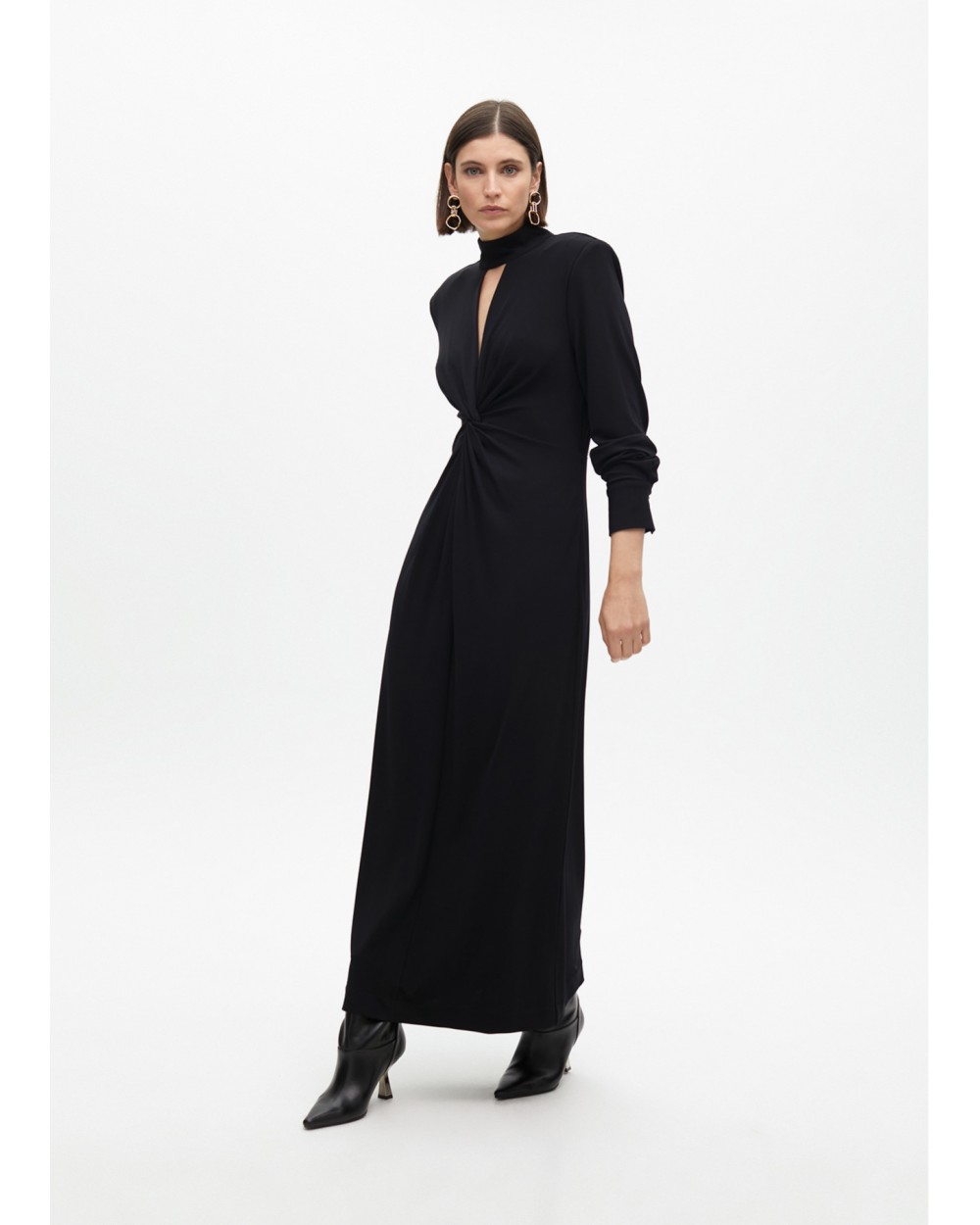Vestido largo confeccionado en tejido suave con detalle en el cuello. Presenta un ajuste sutil que favorece la silueta, con un elegante drapeado frontal. Perfecto para ocasiones especiales por su diseño sofisticado y detalles minimalistas.