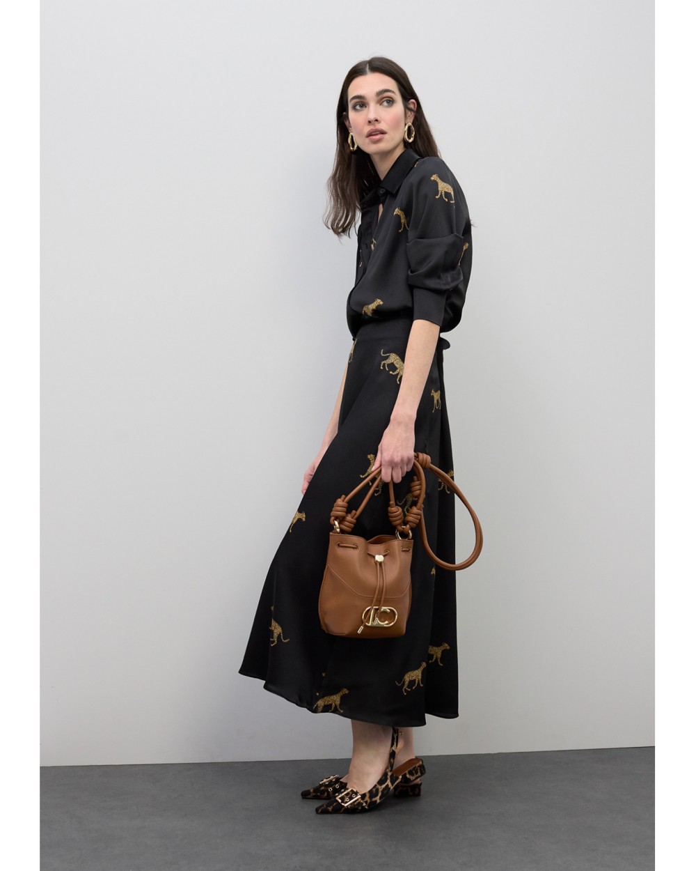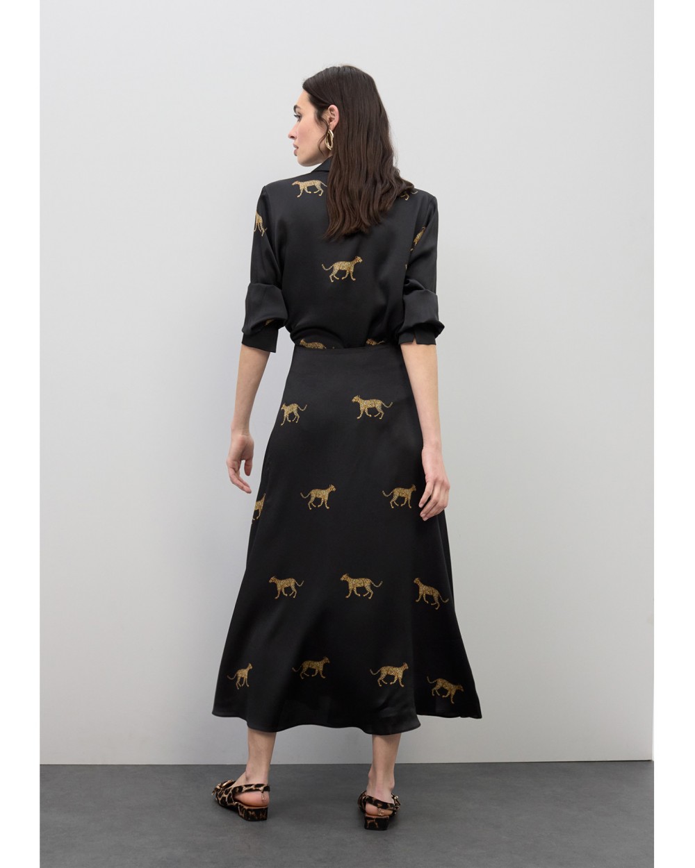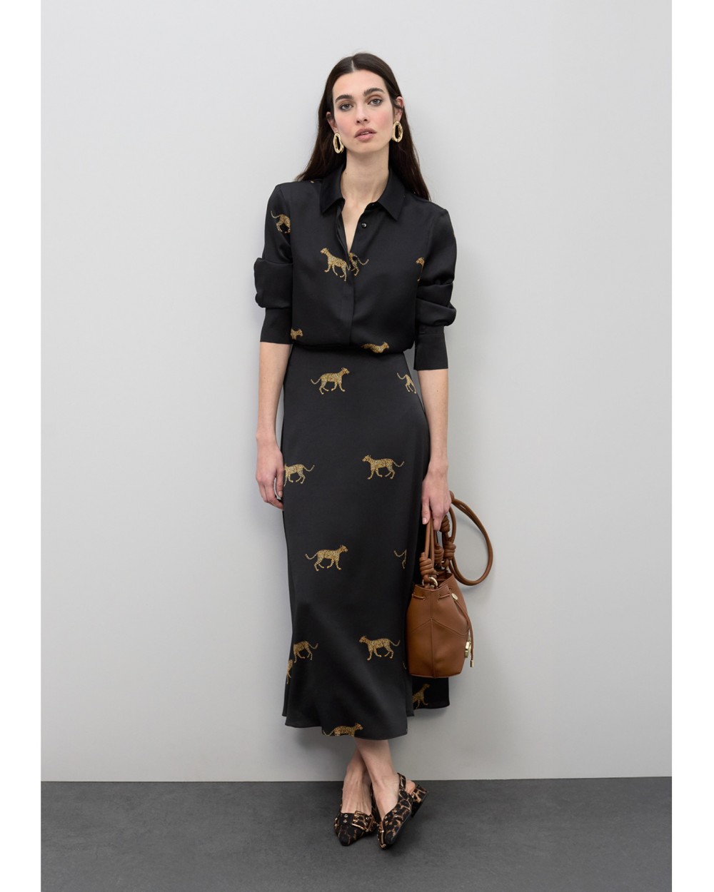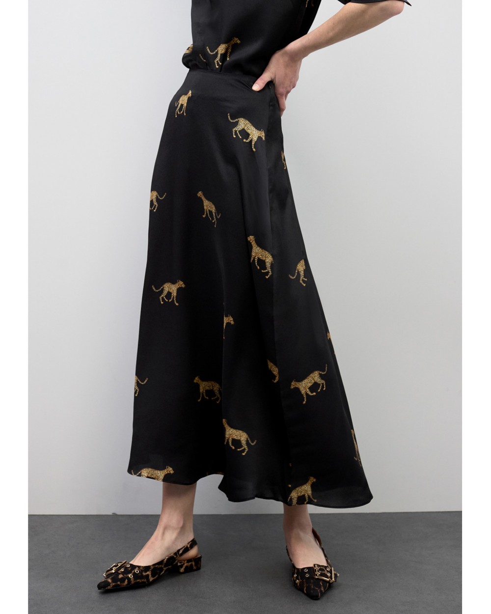 Falda midi confeccionada en satén con exclusivo estampado de leopardo. Diseño fluido que aporta movimiento y elegancia. Cintura alta con cierre oculto. Perfecta para ocasiones especiales, combinando confort y estilo único.
