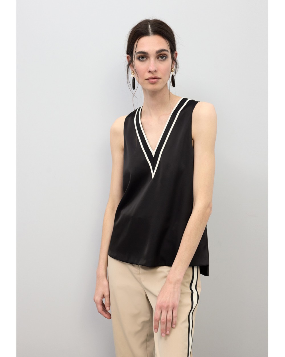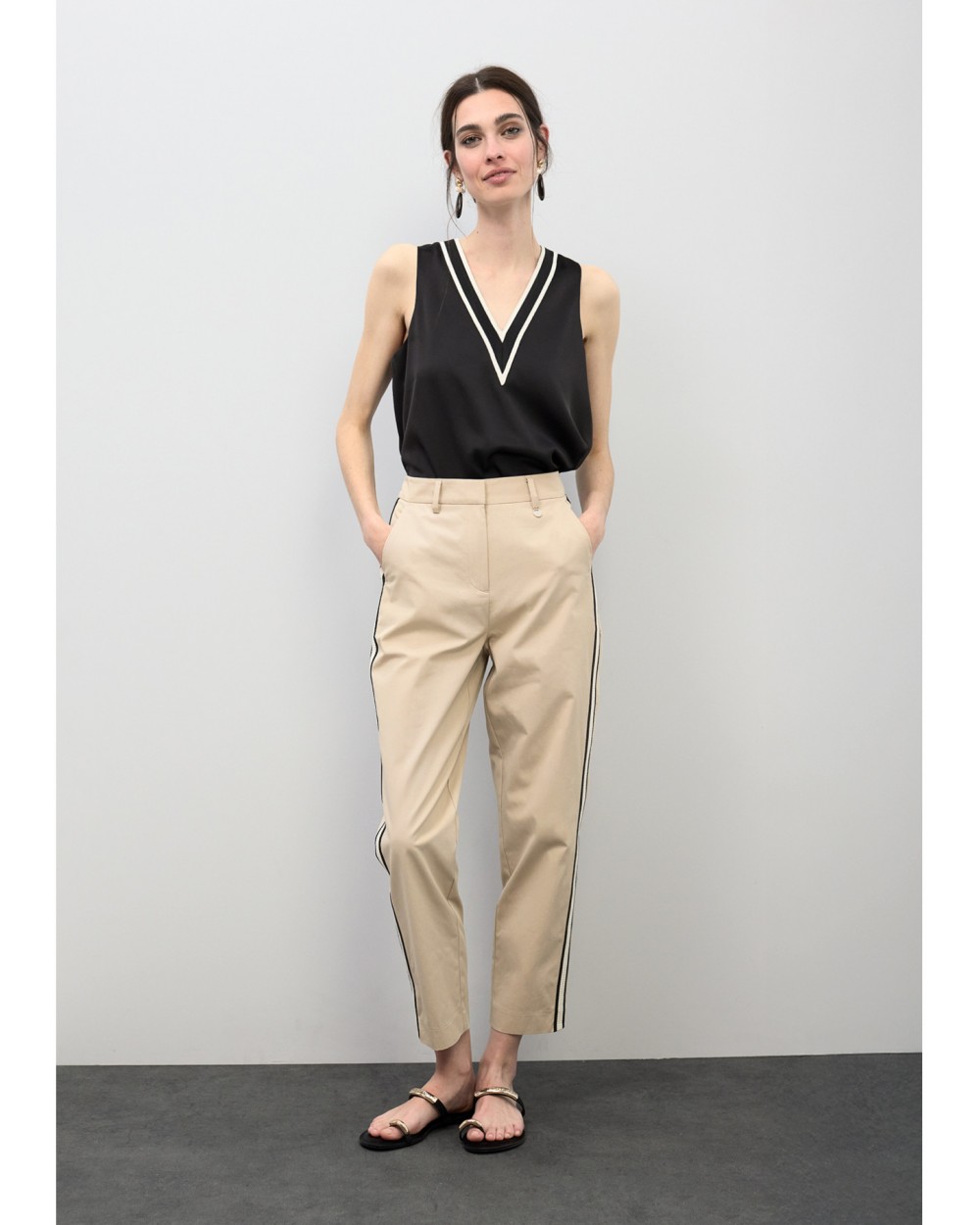 Pantalón recto en tejido suave, con cintura entallada y cierre de cremallera. Detalles de cintas con rayas laterales para un toque moderno. Bajo ligeramente acortado, ideal para combinar con sandalias o tacones.