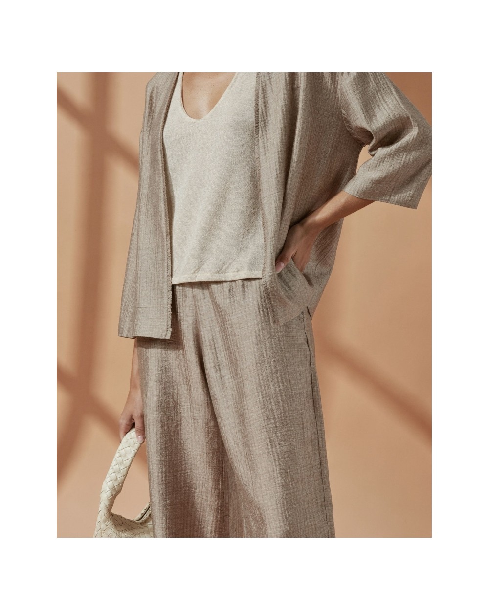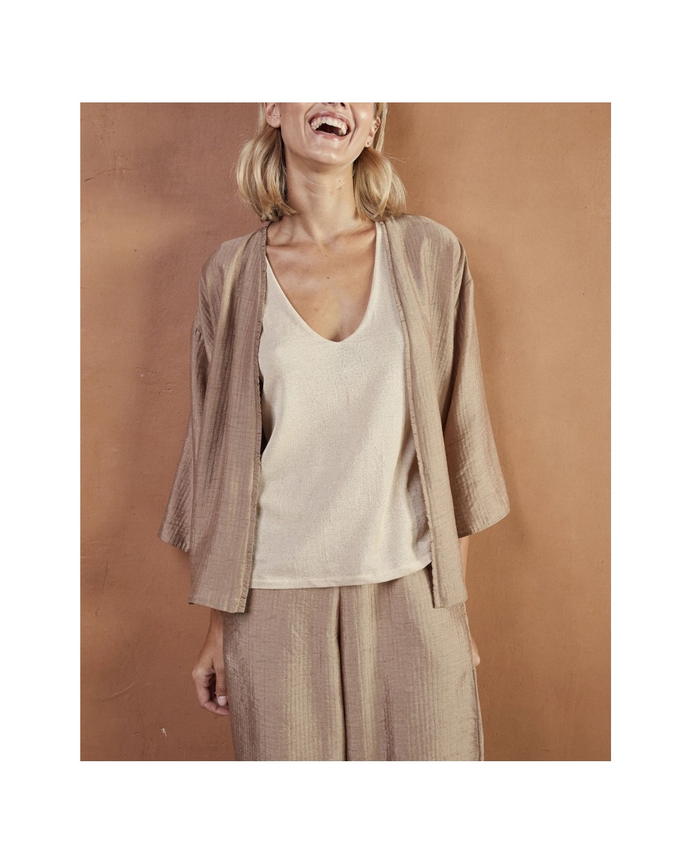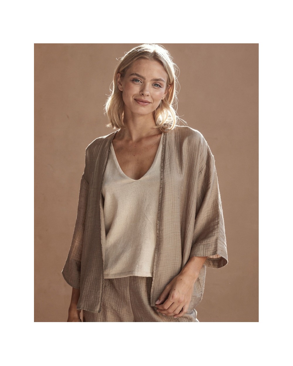 Kimono corto abierto con escote pico y manga tres cuartos. Diseño sin cierre con microvolante en el contorno del cuello. Confeccionado en tejido ligero con viscosa, lyocell y poliamida