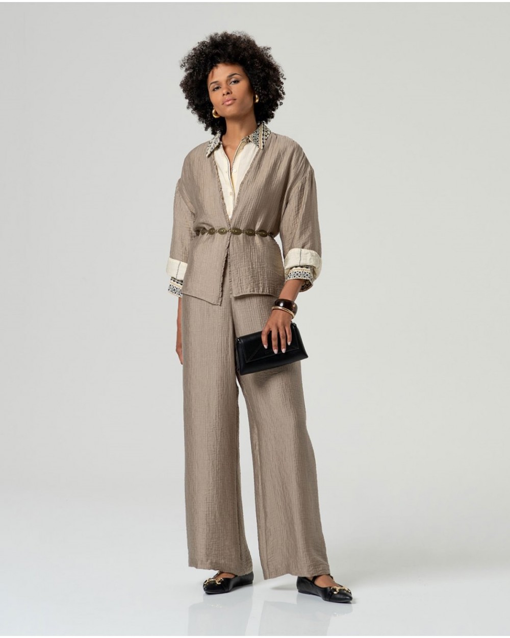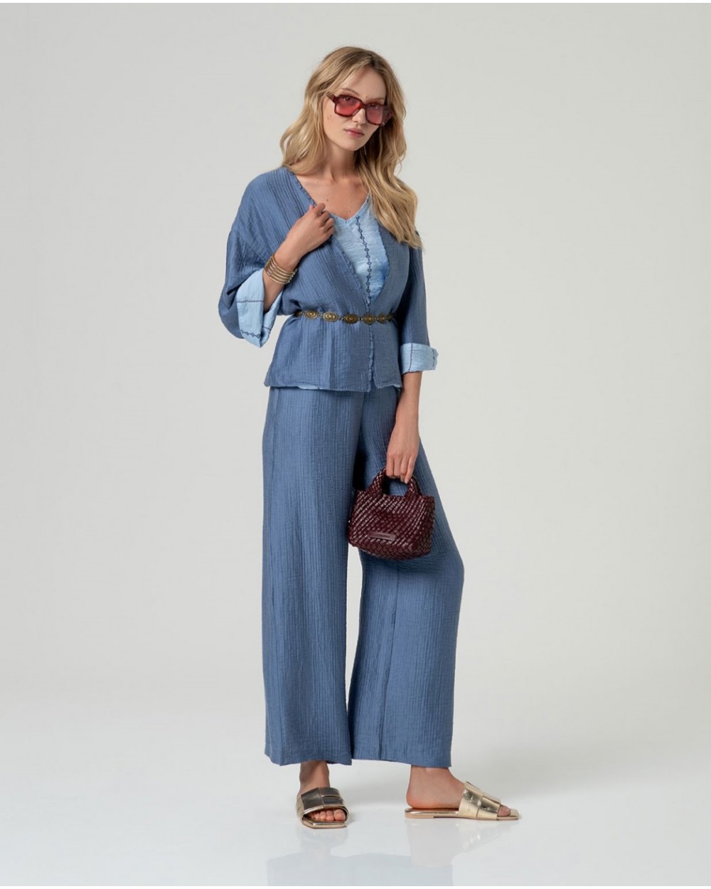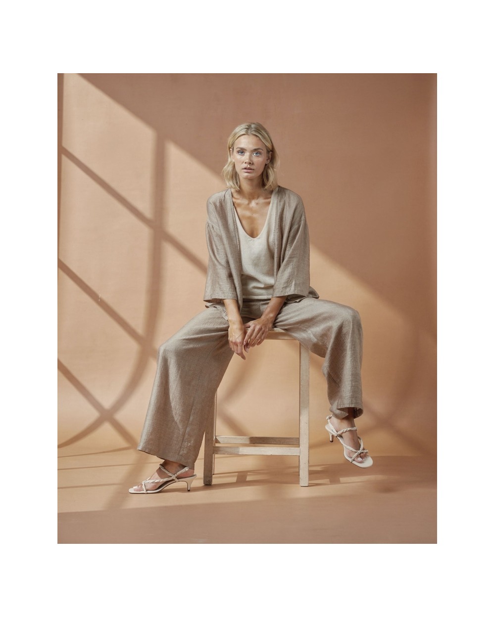 Kimono corto abierto con escote pico y manga tres cuartos. Diseño sin cierre con microvolante en el contorno del cuello. Confeccionado en tejido ligero con viscosa, lyocell y poliamida