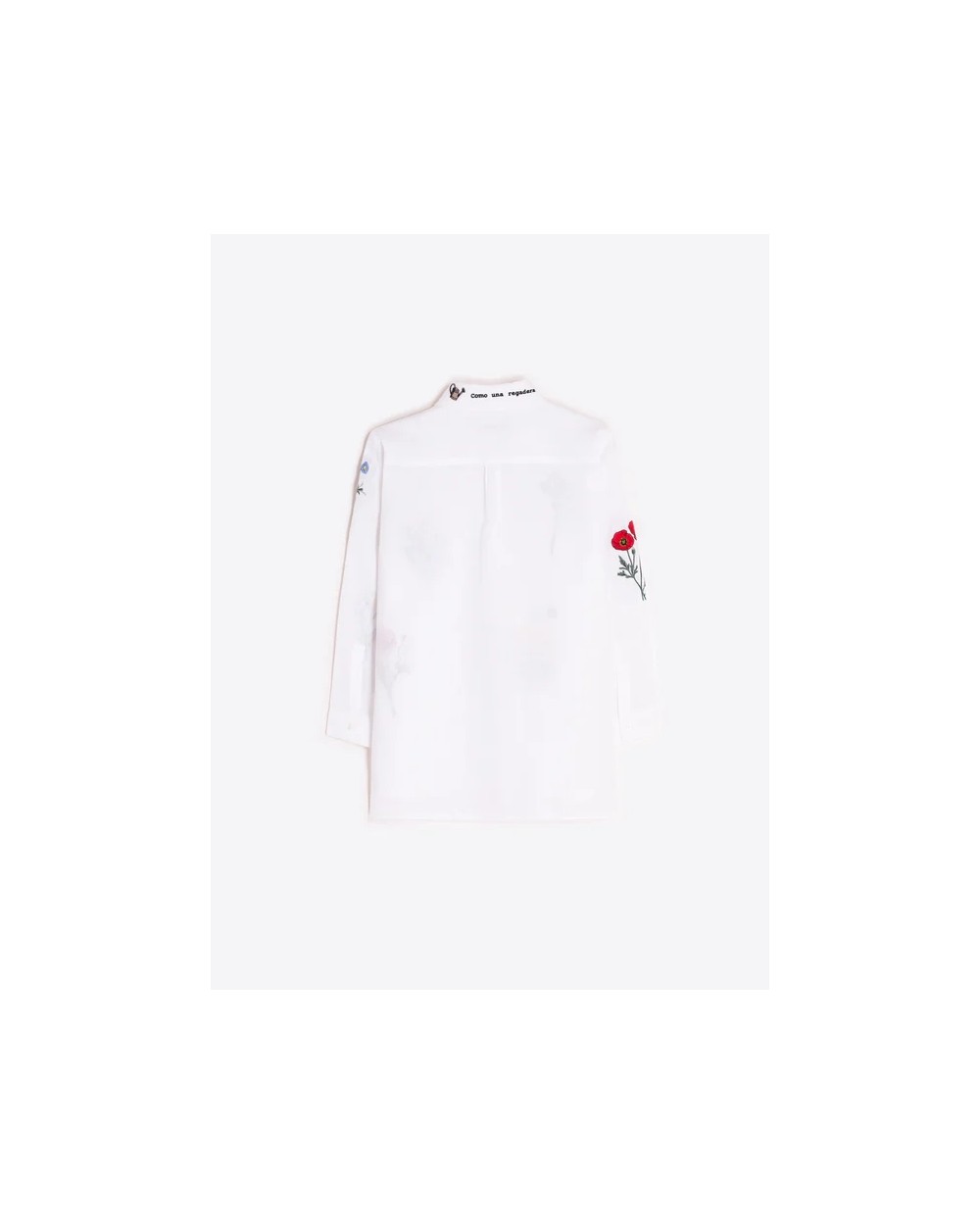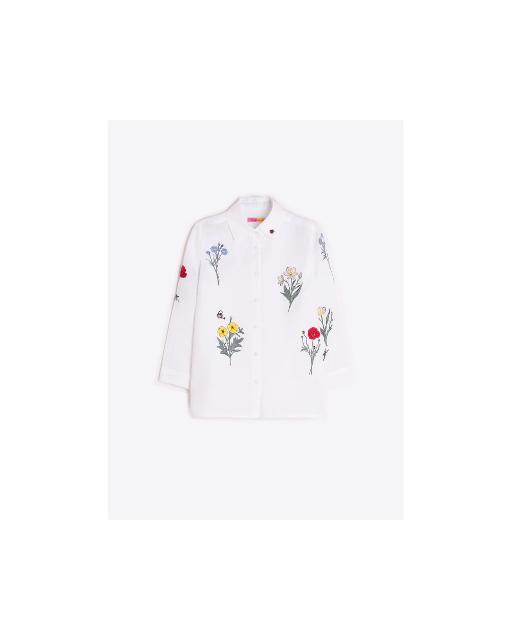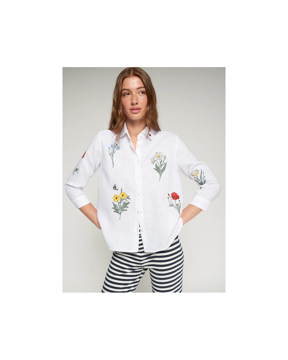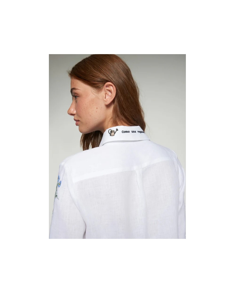 Camisa blanca de lino con flores bordadas en delantero y mangas. Cuello clásico, cierre frontal con botones y manga 3/4.