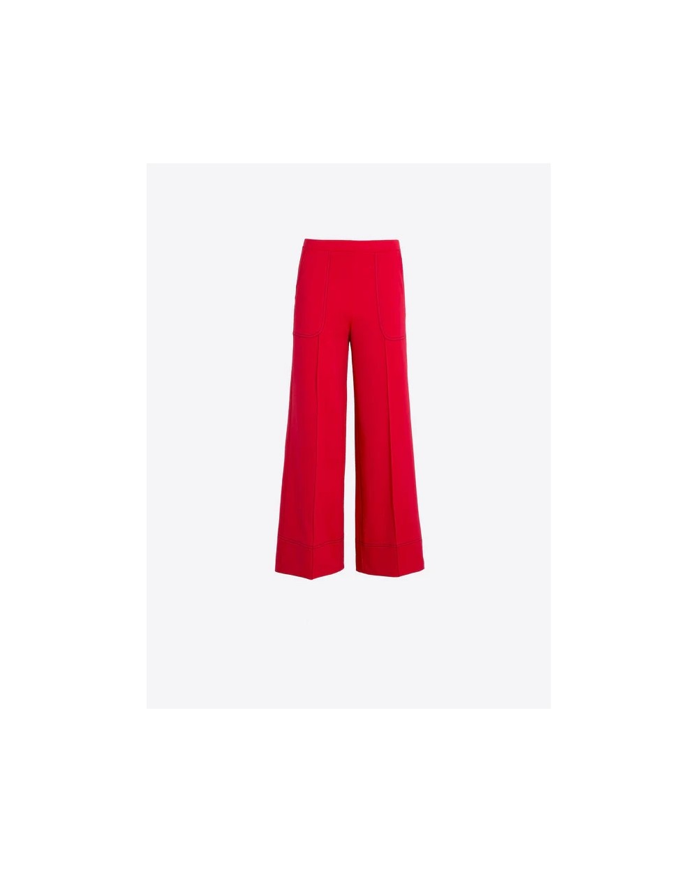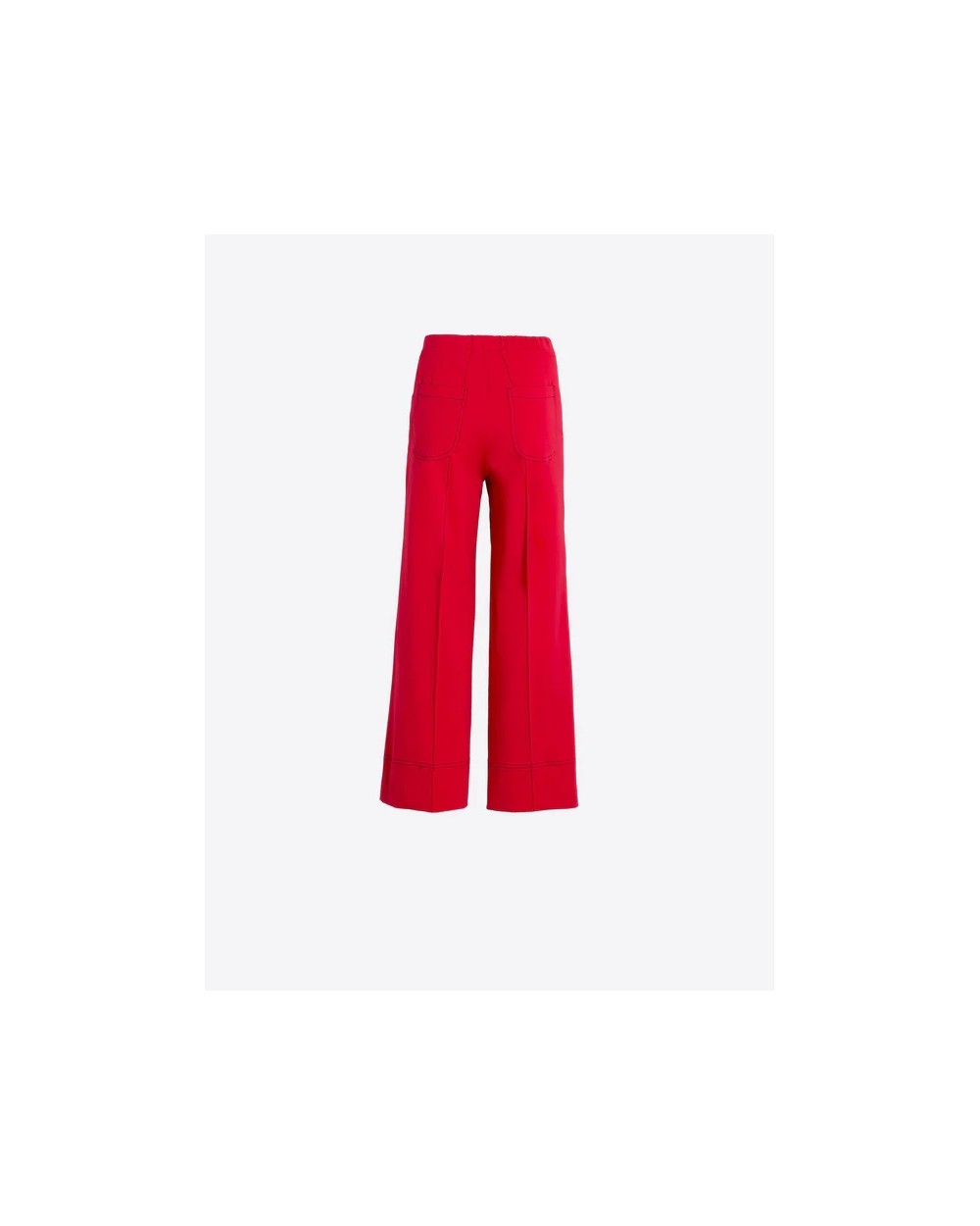 Pantalón rojo de corte ancho con cintura lisa y bolsillos superiores. Lleva pespuntes marcados en la parte delantera y un bajo amplio que estructura la prenda.