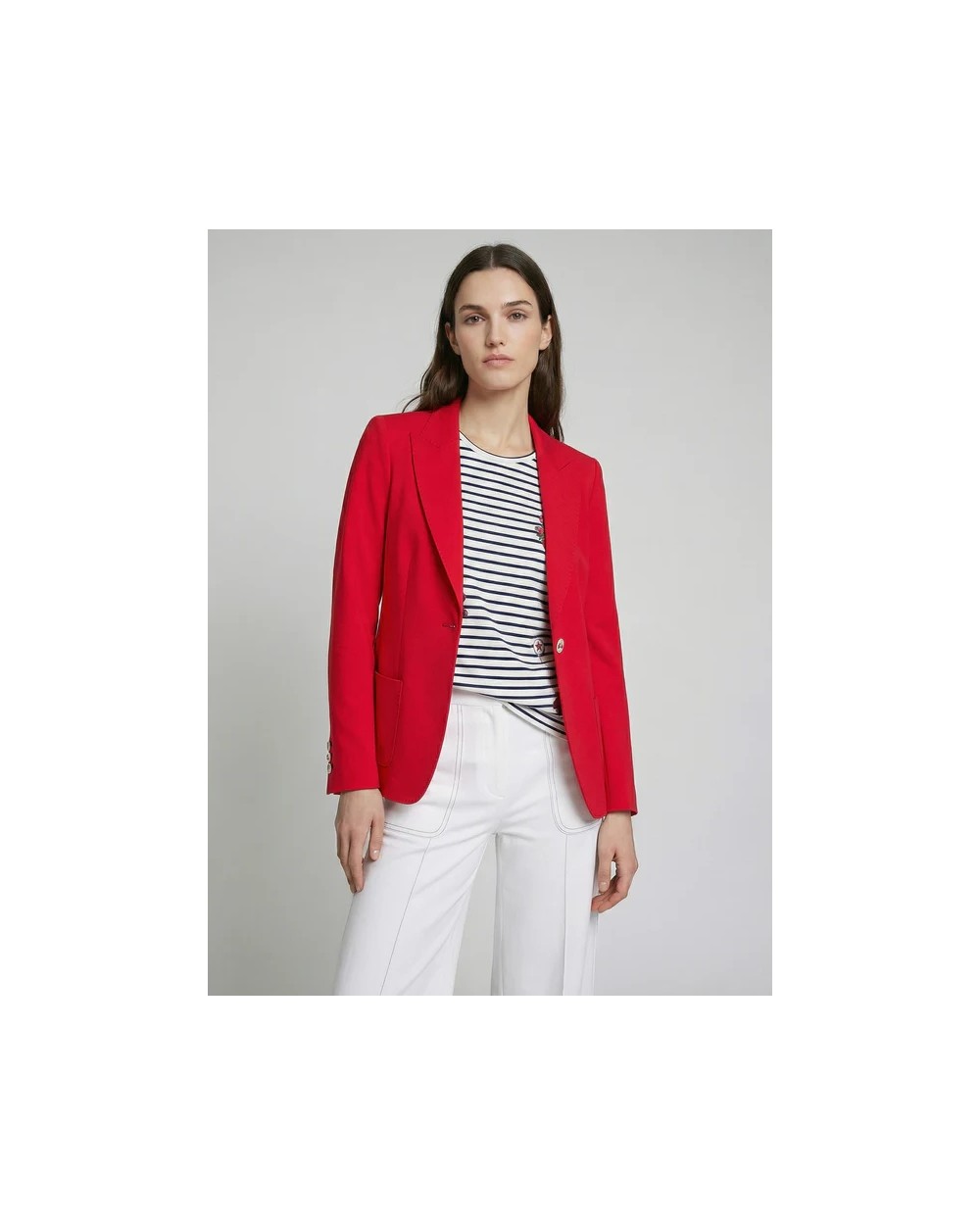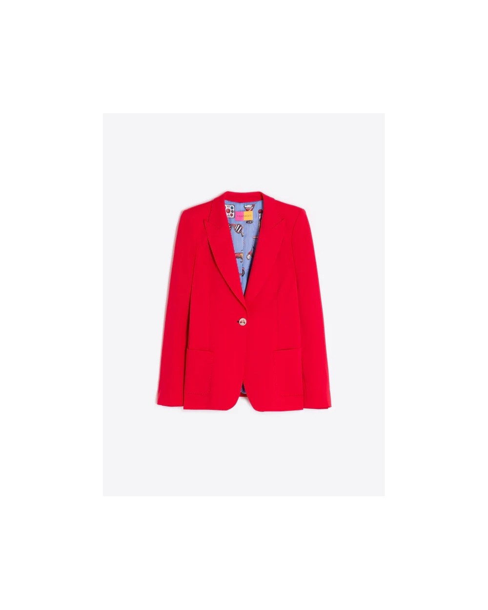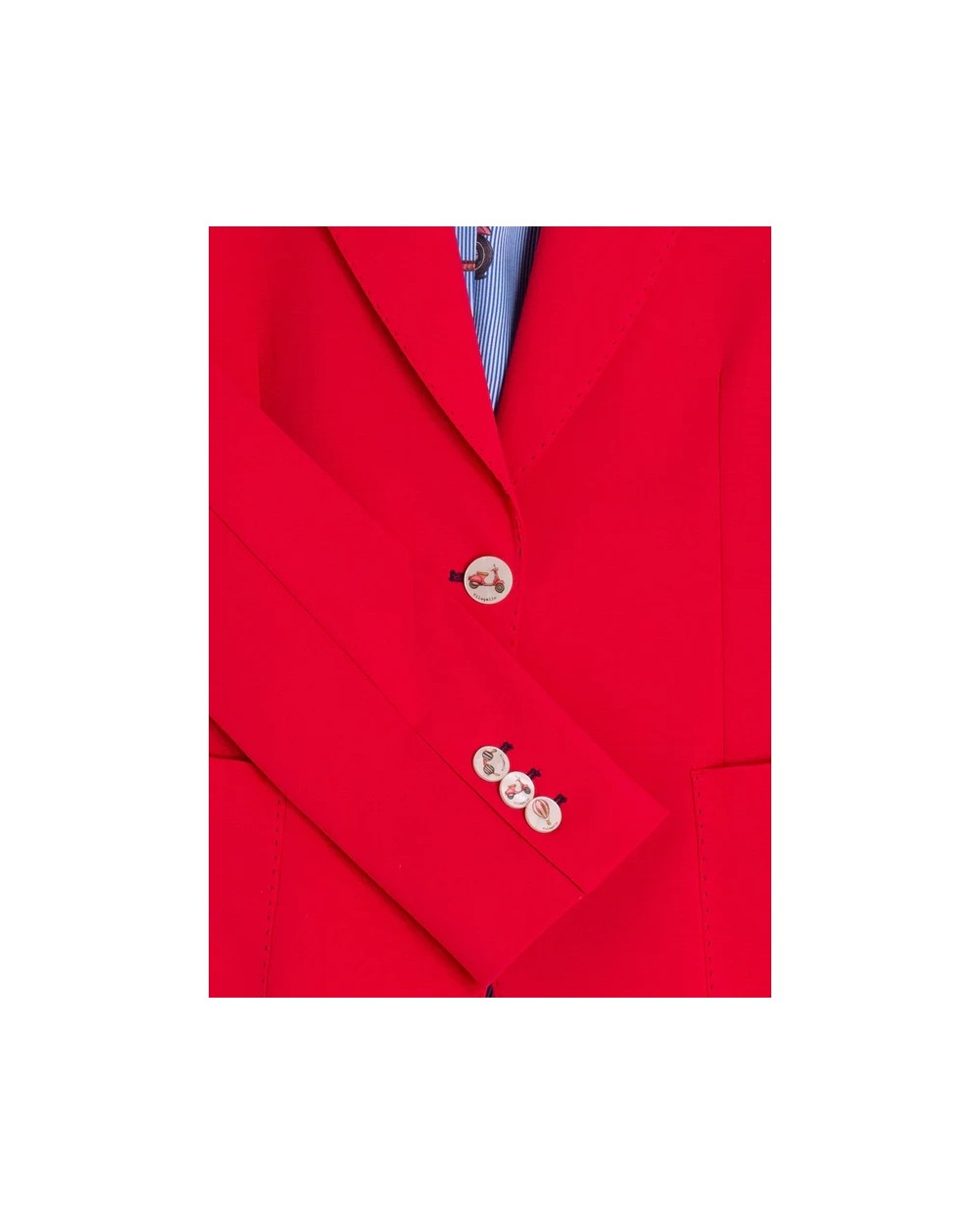 Chaqueta roja con solapa clásica y cierre de botón ilustrado. Incluye dos bolsillos de parche con pespunte visible y forro interior.