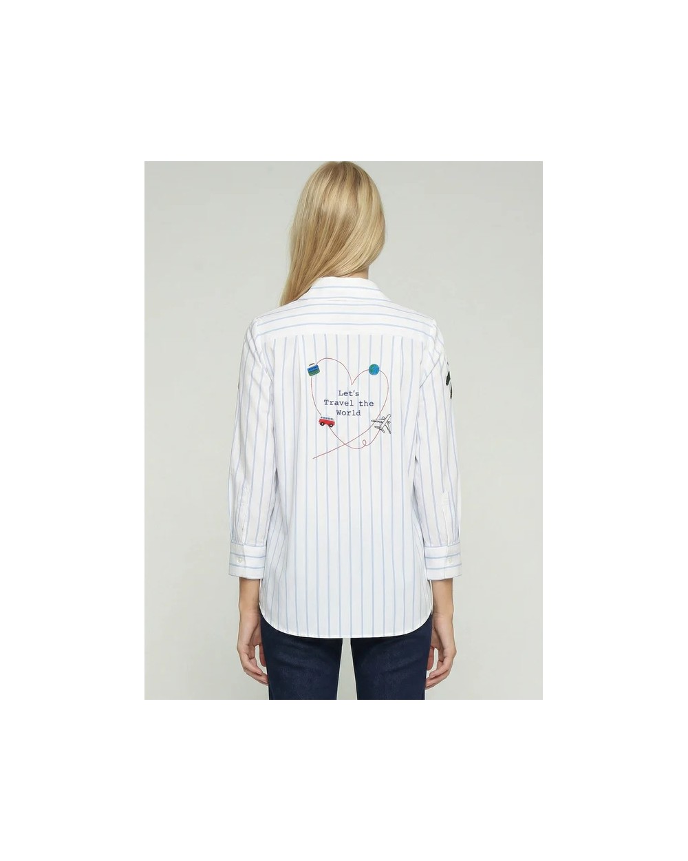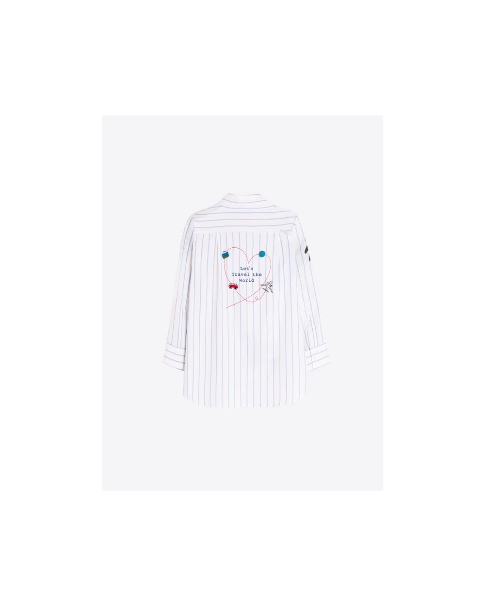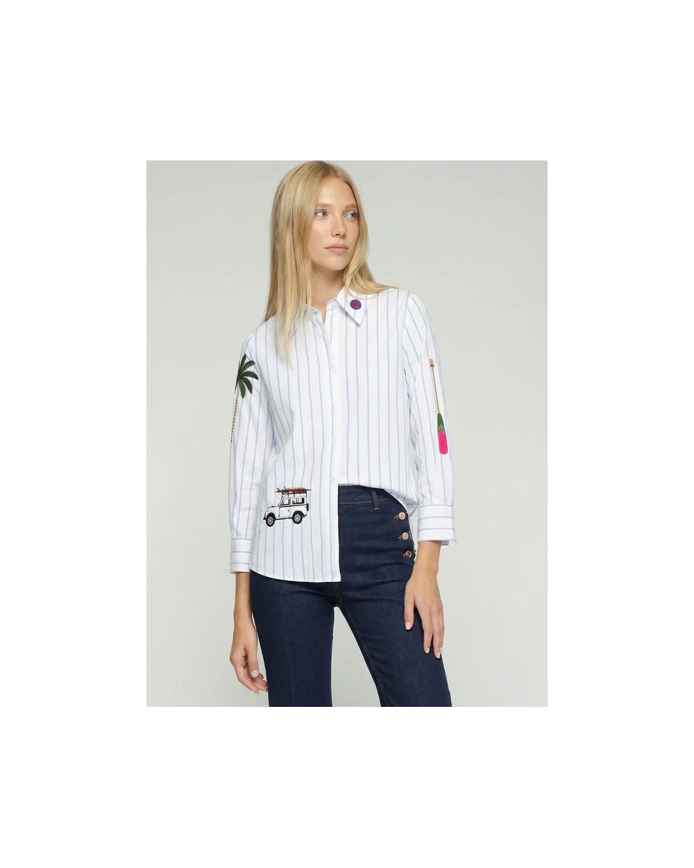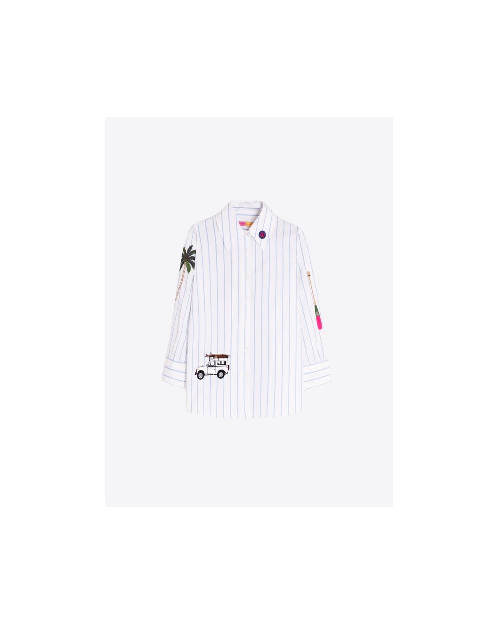 Camisa blanca de rayas azules. Cuello camisero y manga larga 3/4. Diseño con bordado surf con motivos de palmeras y viajes.