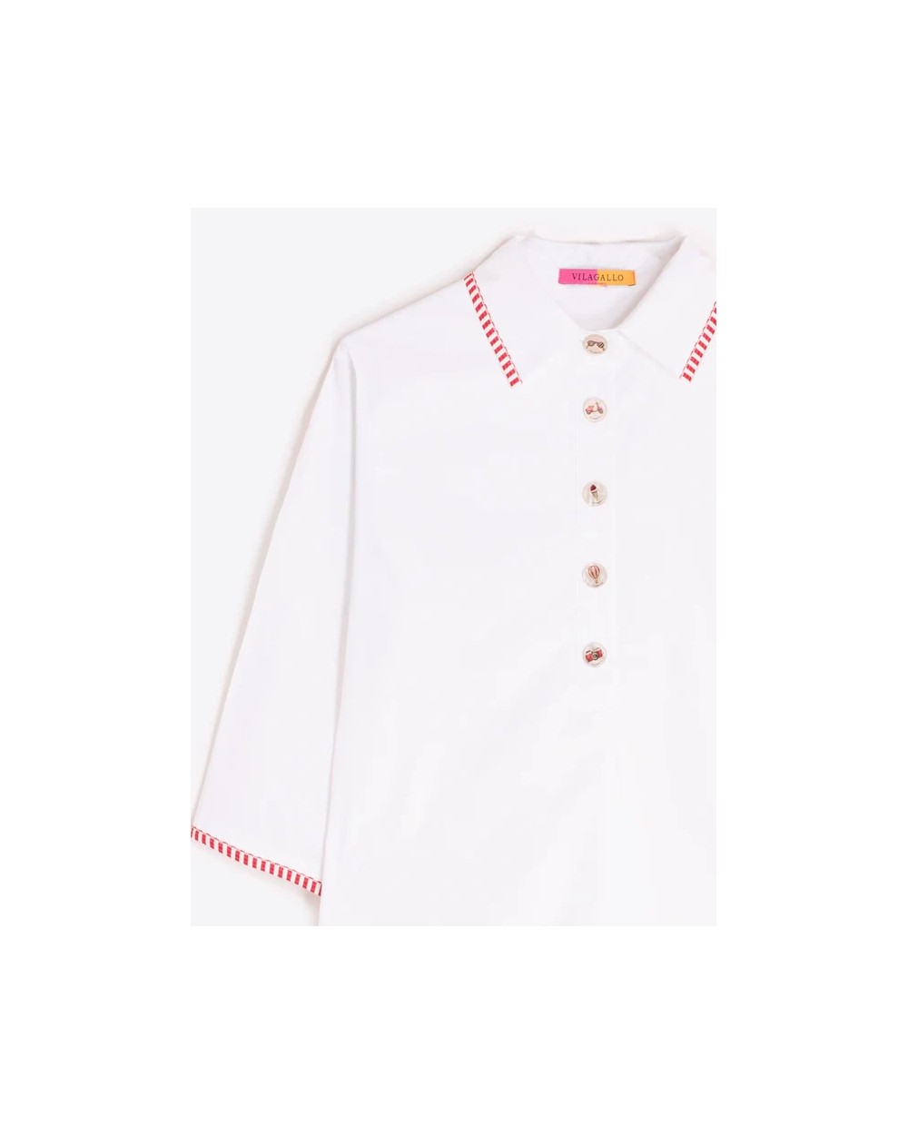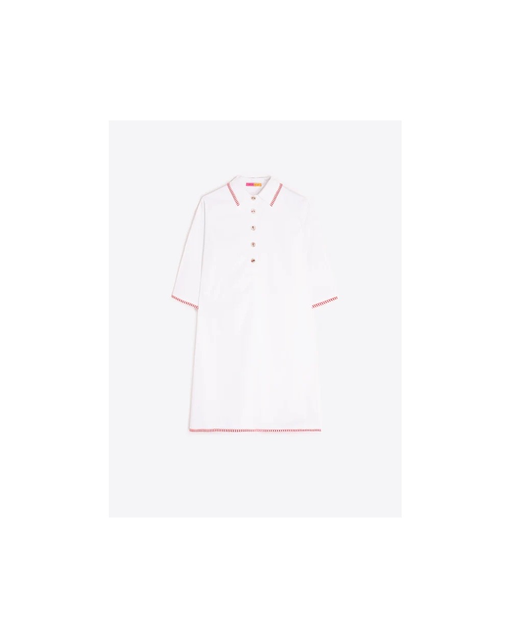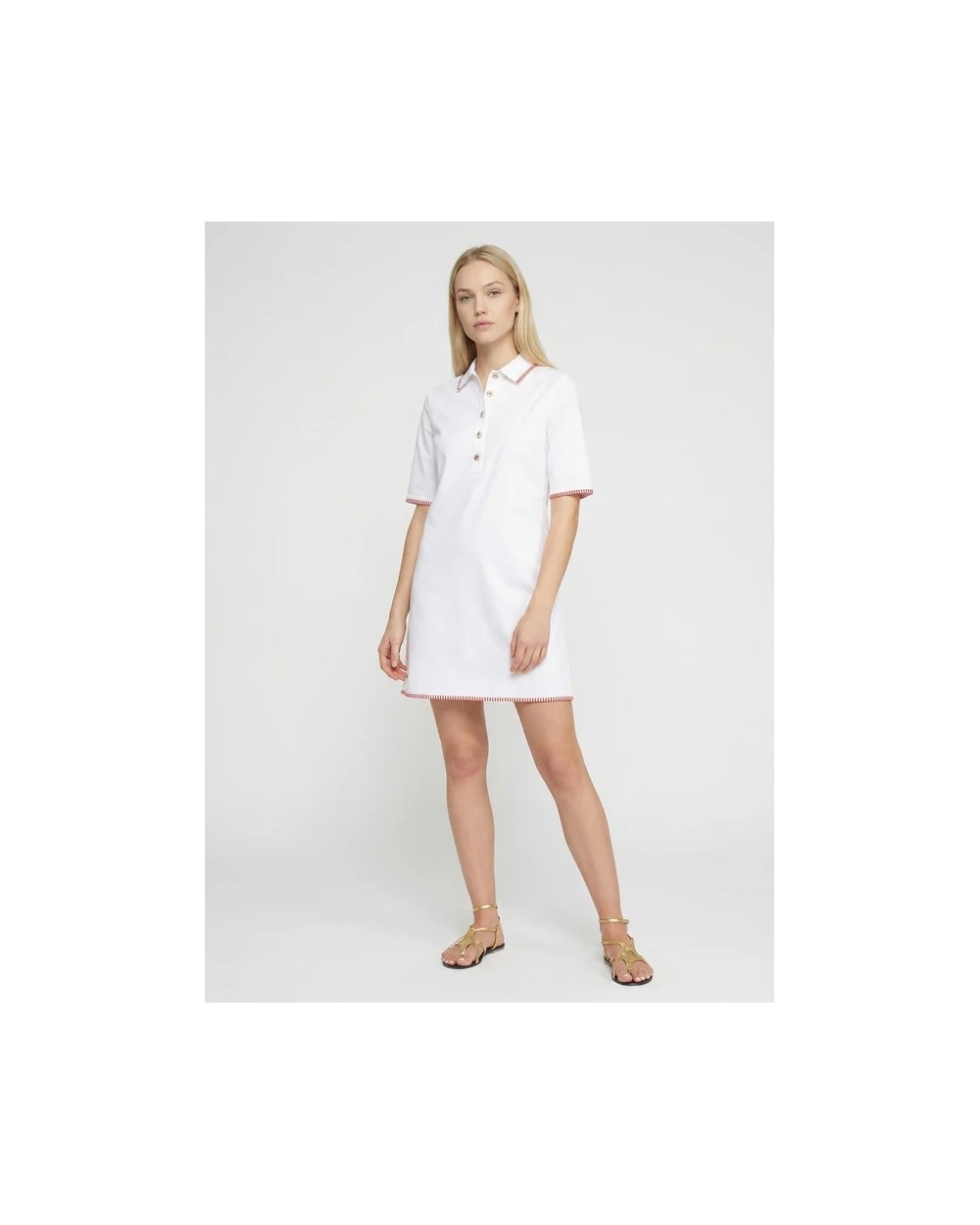 Vestido de corte recto en color blanco con cuello camisero y cierre frontal de botones. Manga corta y acabados con ribete en contraste rojo en cuello, mangas y bajo.
