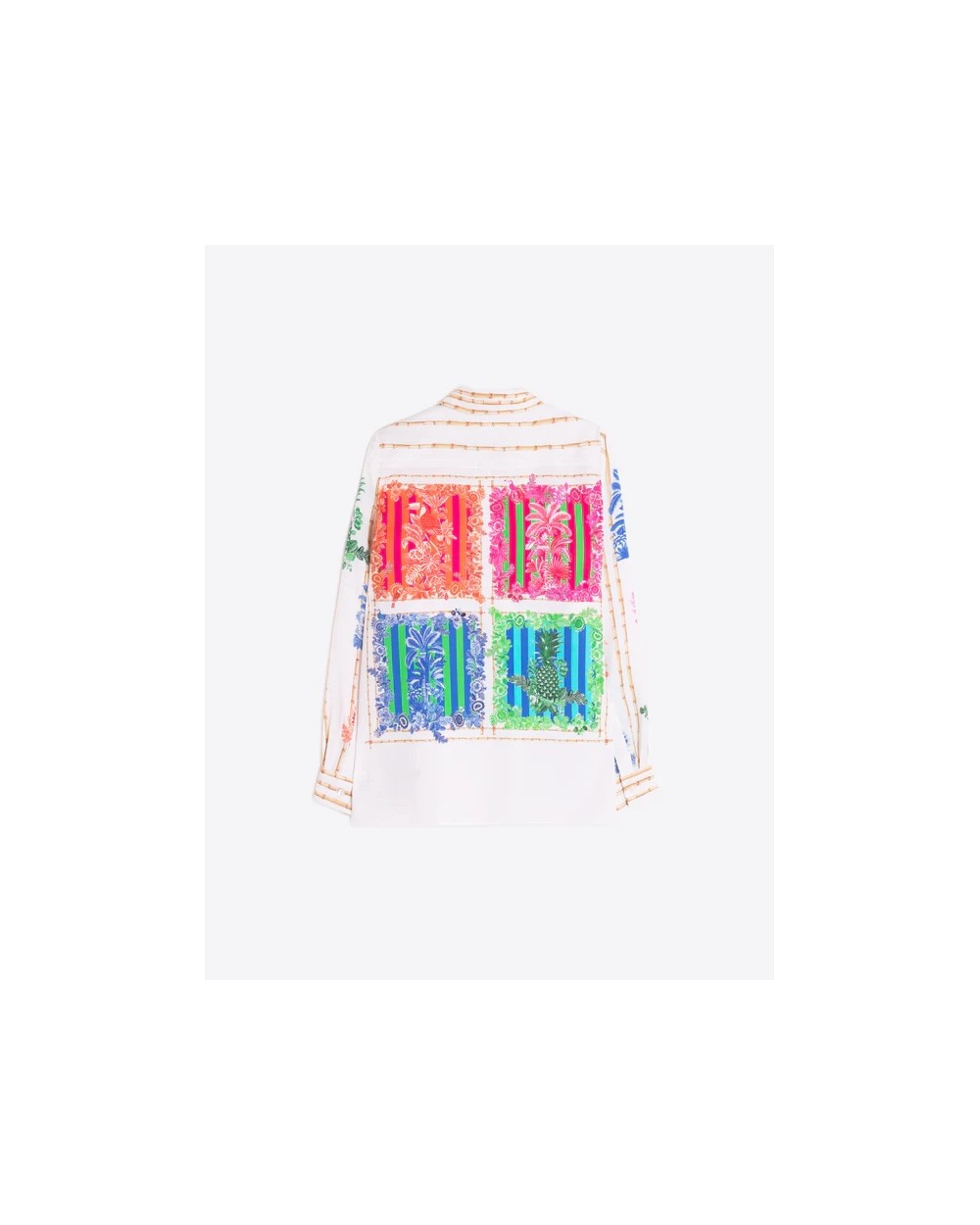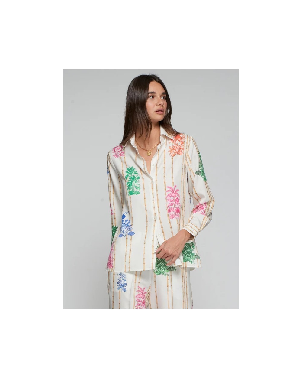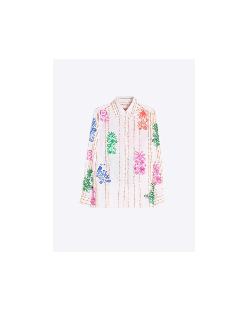 Camisa de corte clásico con cuello camisero y cierre frontal de botones. El diseño combina un estampado vertical de varas de bambú con ilustraciones de motivos tropicales en colores vivos. Manga larga con puños abotonados y bajo recto.