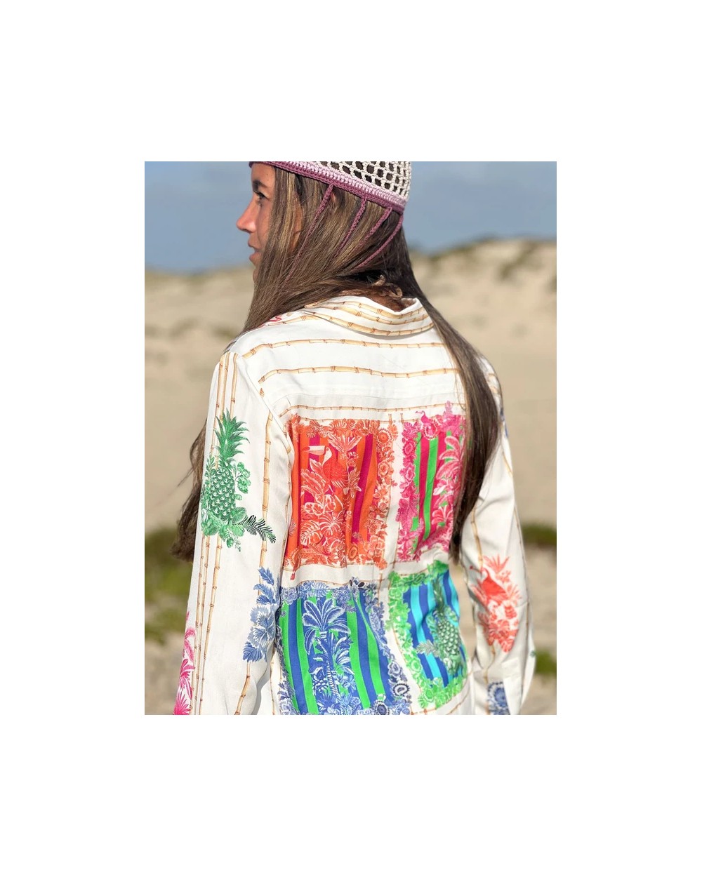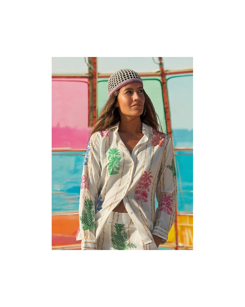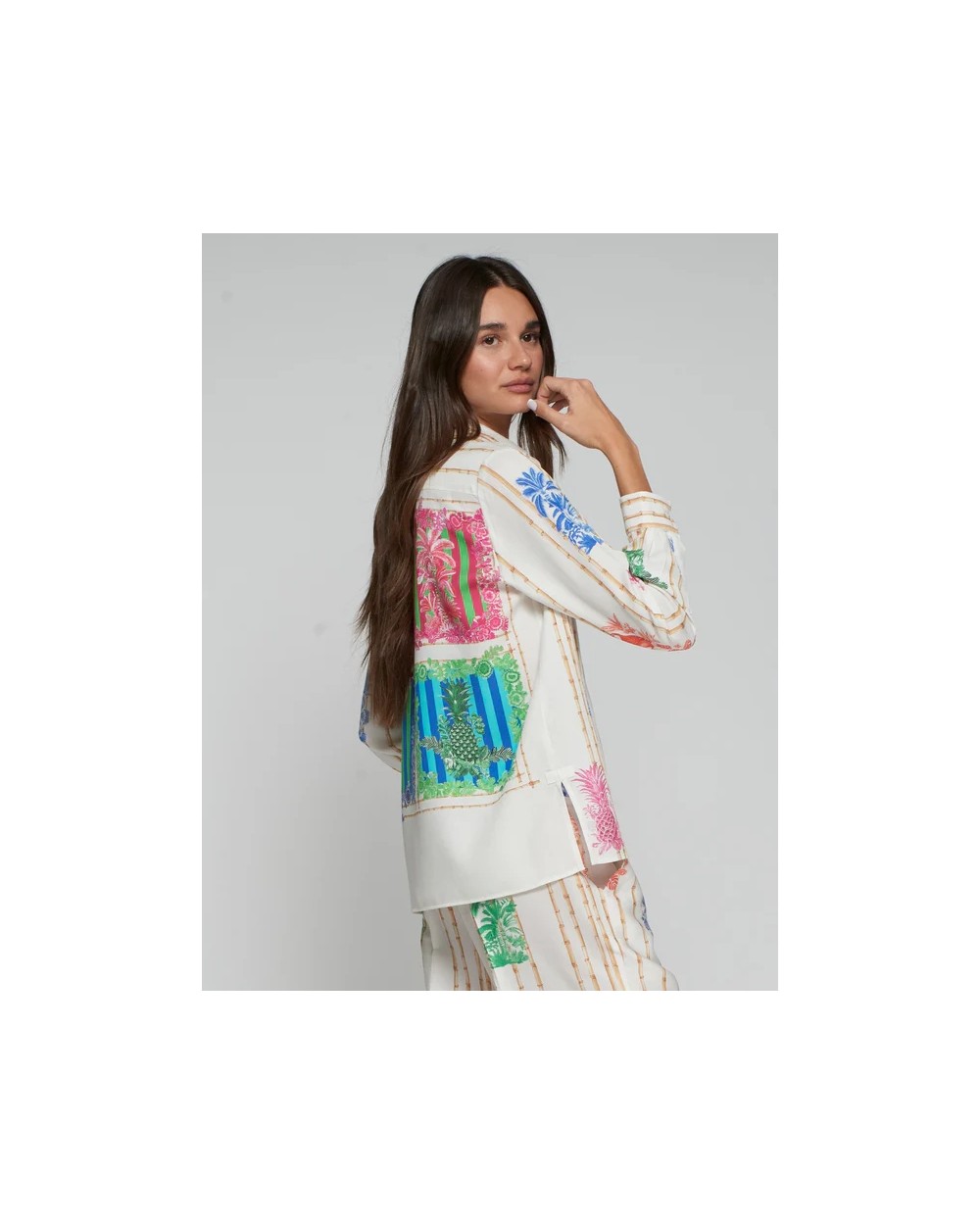 Camisa de corte clásico con cuello camisero y cierre frontal de botones. El diseño combina un estampado vertical de varas de bambú con ilustraciones de motivos tropicales en colores vivos. Manga larga con puños abotonados y bajo recto.