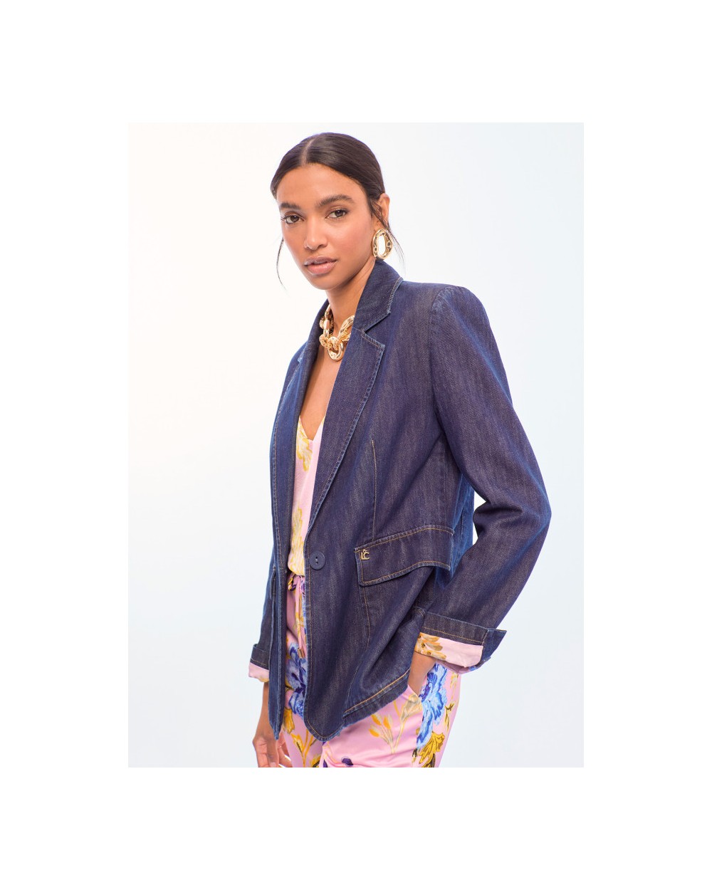 Americana entallada confeccionada en denim de alta calidad. Presenta bolsillos plastrón, solapas clásicas y cierre de botón central. Ideal para un look urbano chic.