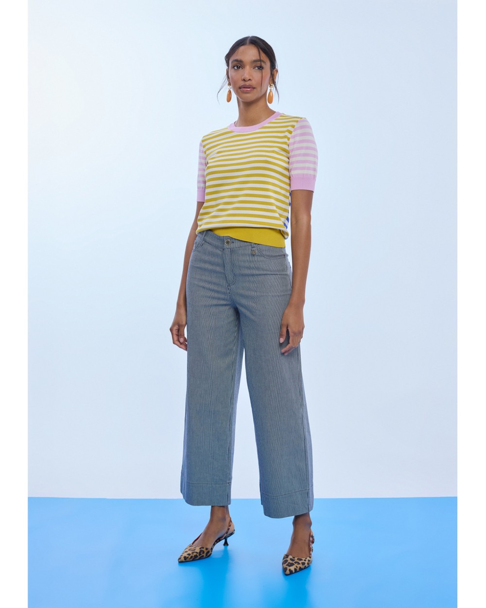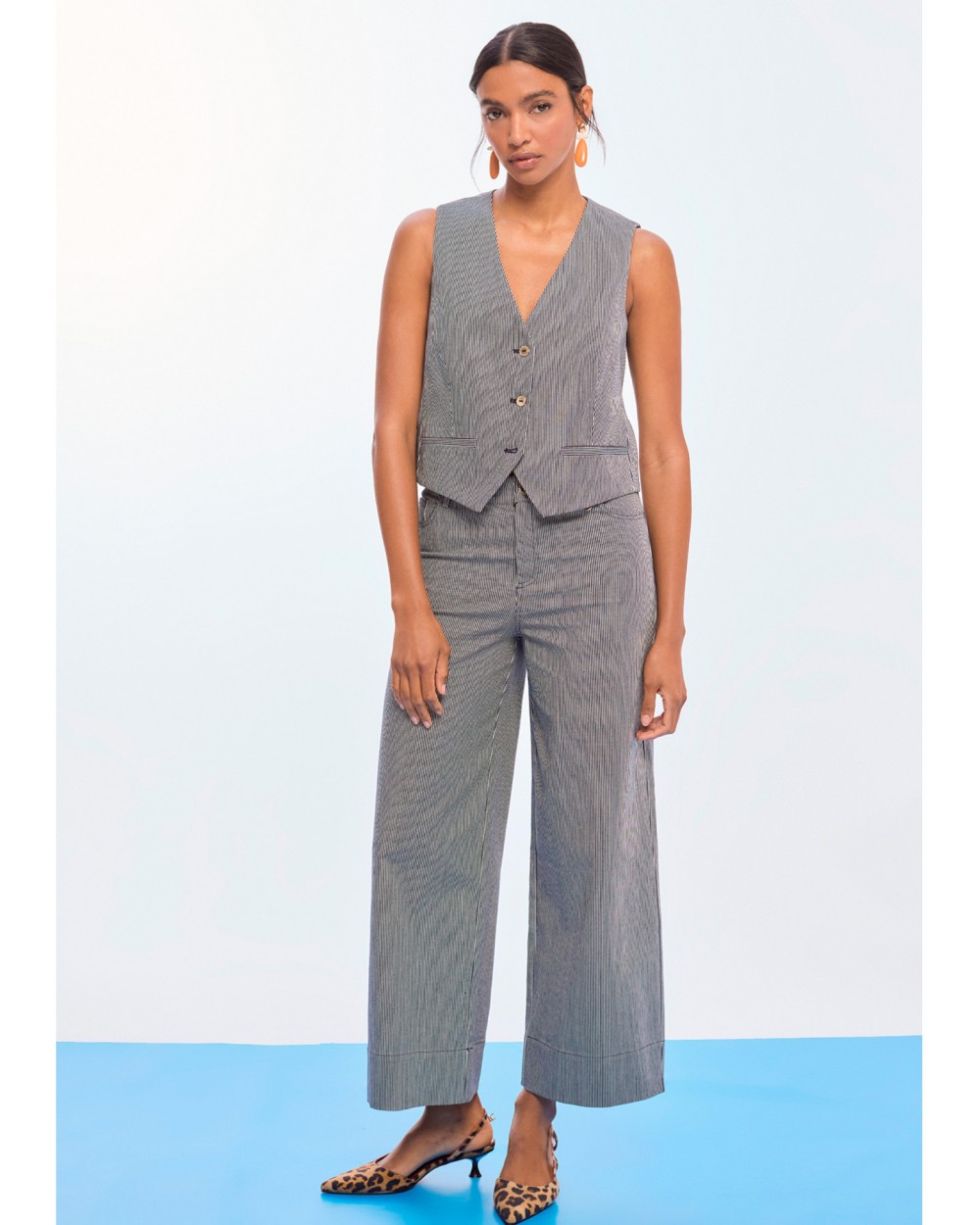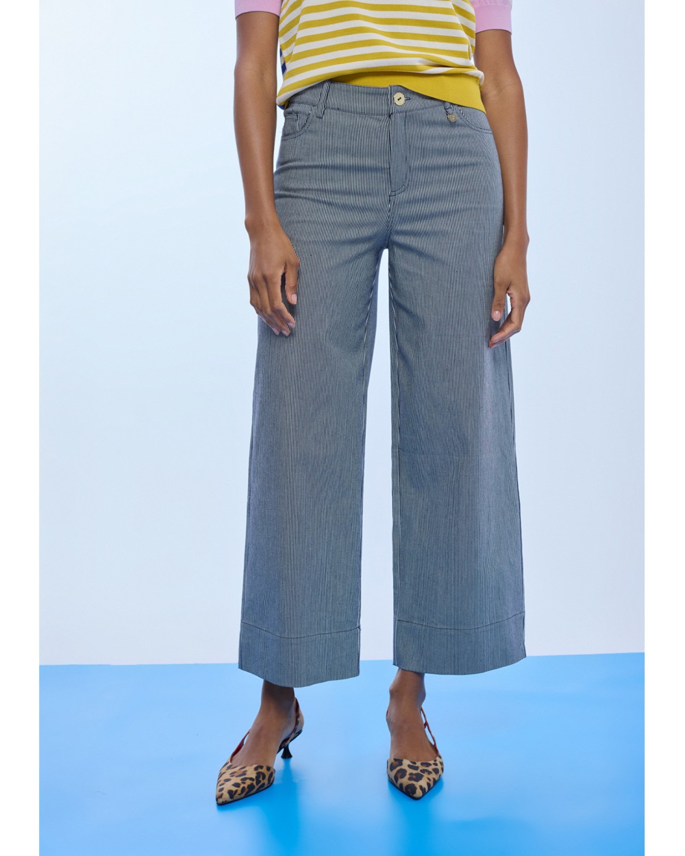 Pantalón culotte moderno en sarga con un elegante diseño de rayas. Cintura alta con cierre de botón y cremallera. Amplio ancho de pierna para comodidad y estilo. Diseñado para cualquier ocasión.