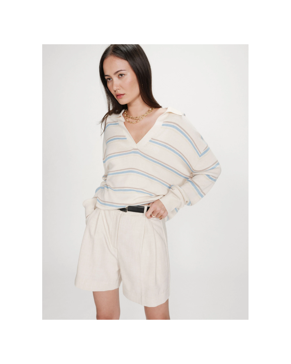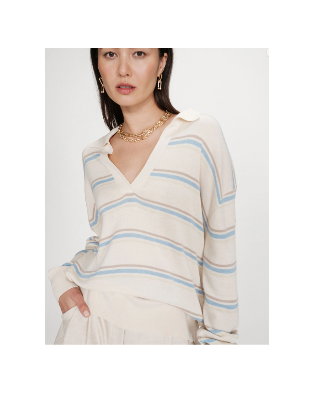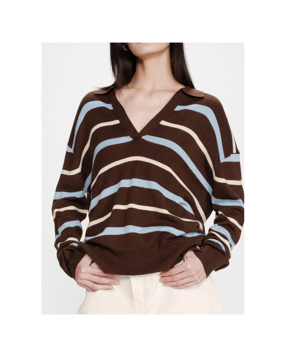 El jersey oversize de VAPORETTO tiene un aspecto casual y atemporal. El cuello polo y las mangas largas se combinan con un fino punto que mezcla seda y lana, para una silueta elegante y sin esfuerzo. El jersey de manga larga de VAPORETTO, disponible en versiones lisas o a rayas, tiene acabados acanalados en los puños y la parte inferior del jersey que estructuran sutilmente la silueta.