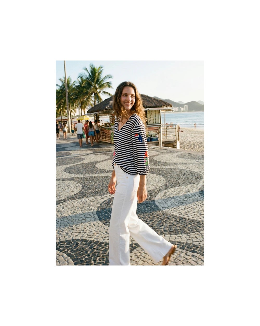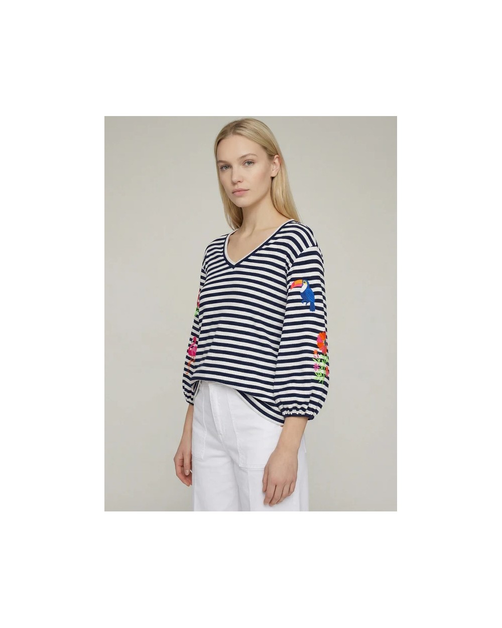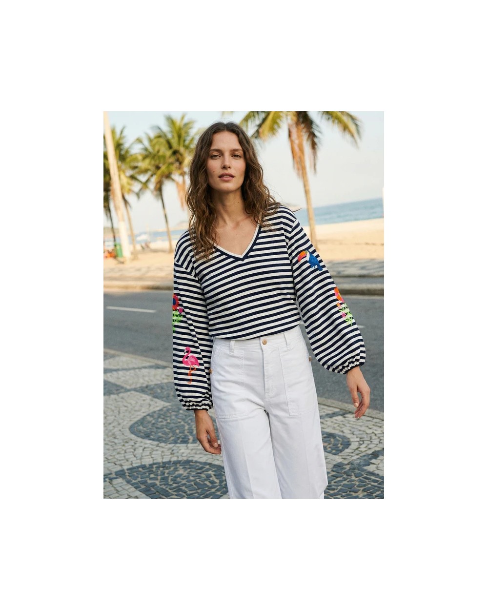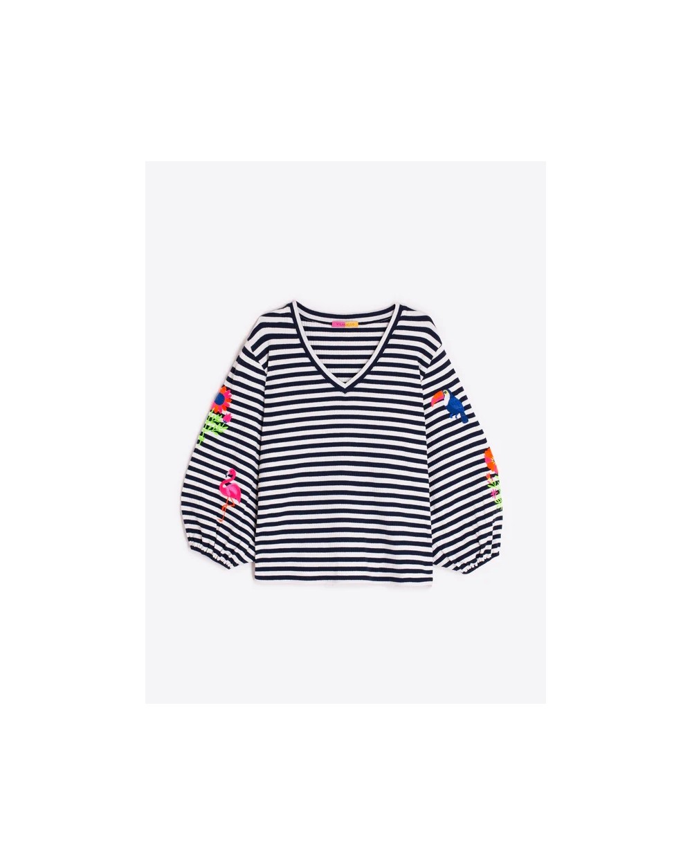 Jersey de rayas azul marino y blanco con cuello pico y mangas abullonadas. Bordados de tucán, flamenco y flores en ambas mangas.Composiciòn: 95%ALGODON5%ELASTANO