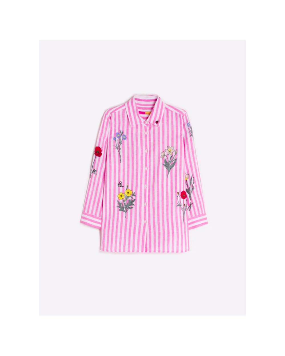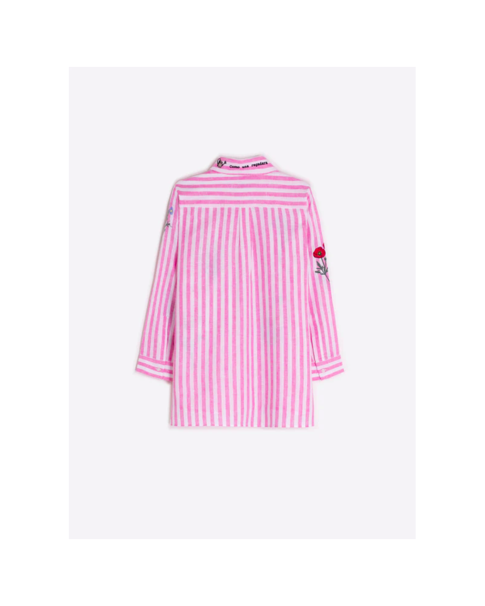 Camisa de rayas verticales en rosa y blanco con flores bordadas en tonos vivos distribuidas en delantero y mangas. Lleva cuello clásico, cierre frontal con botones vistos y manga larga con puño. El tejido es ligero y ofrece un acabado limpio y uniforme.