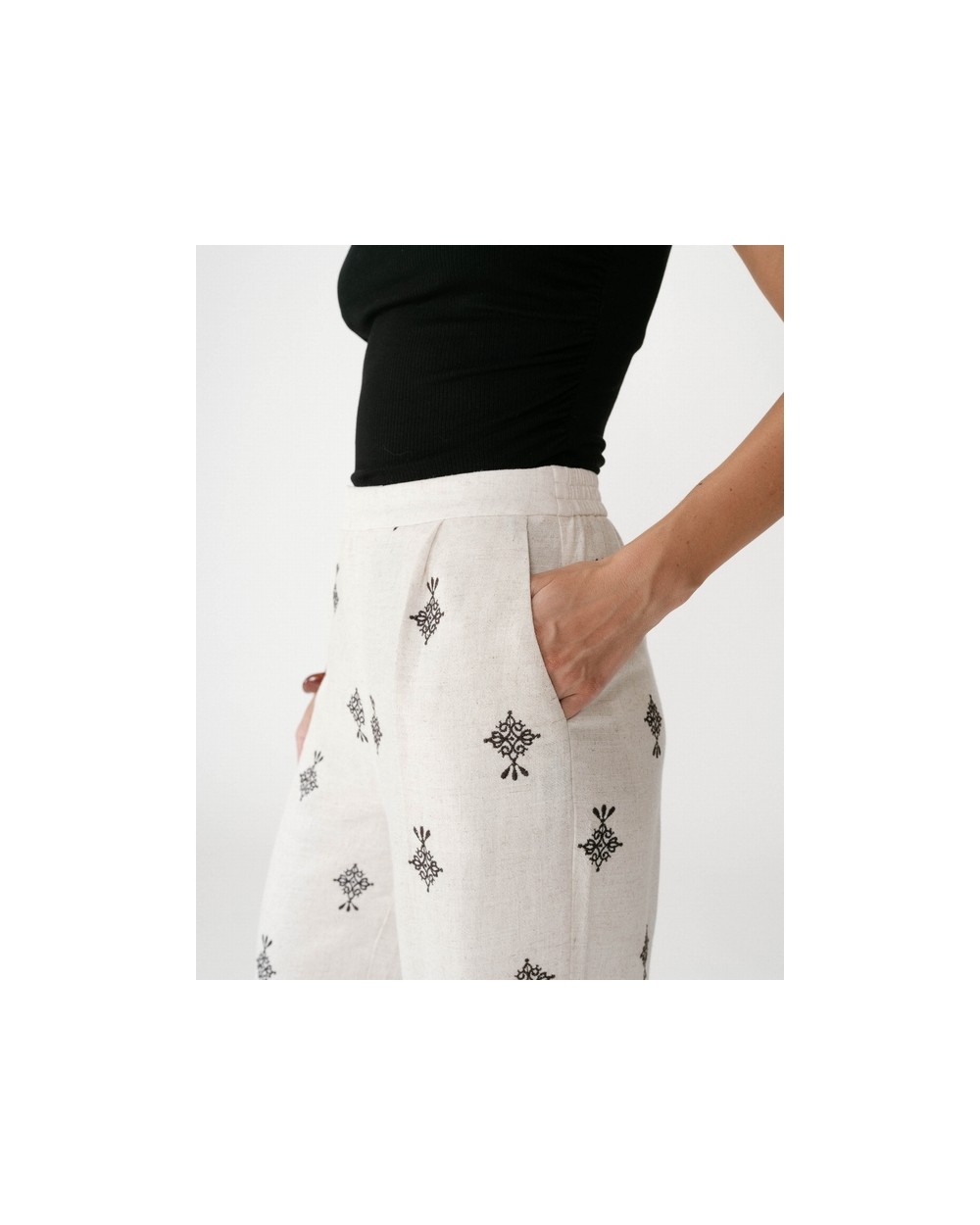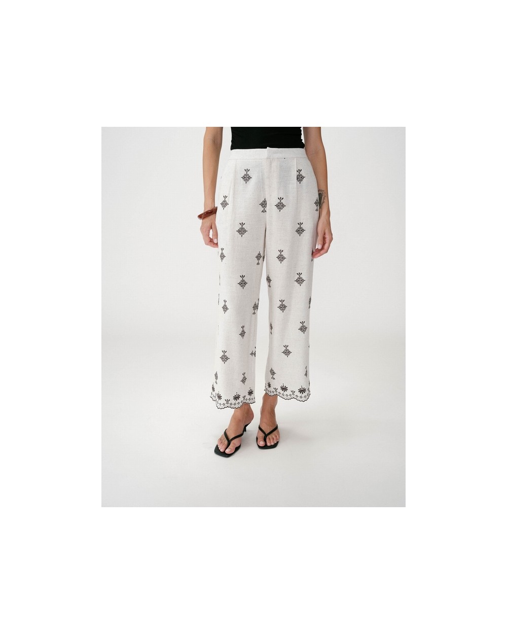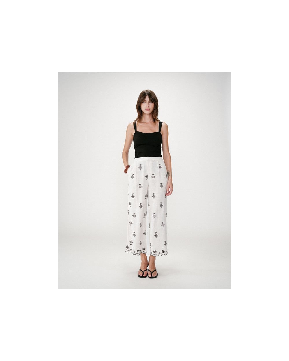 WAREN es un pantalón bordado de 7/8. Diseñado con un corte recto favorecedor, cuenta con una cintura elástica en la parte trasera, pliegues marcados con hierro en la parte delantera y bolsillos inclinados. Un delicado dobladillo ondulado completa este estilo con un toque de sofisticación.