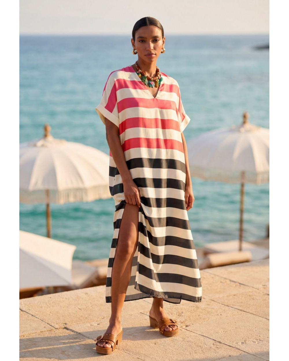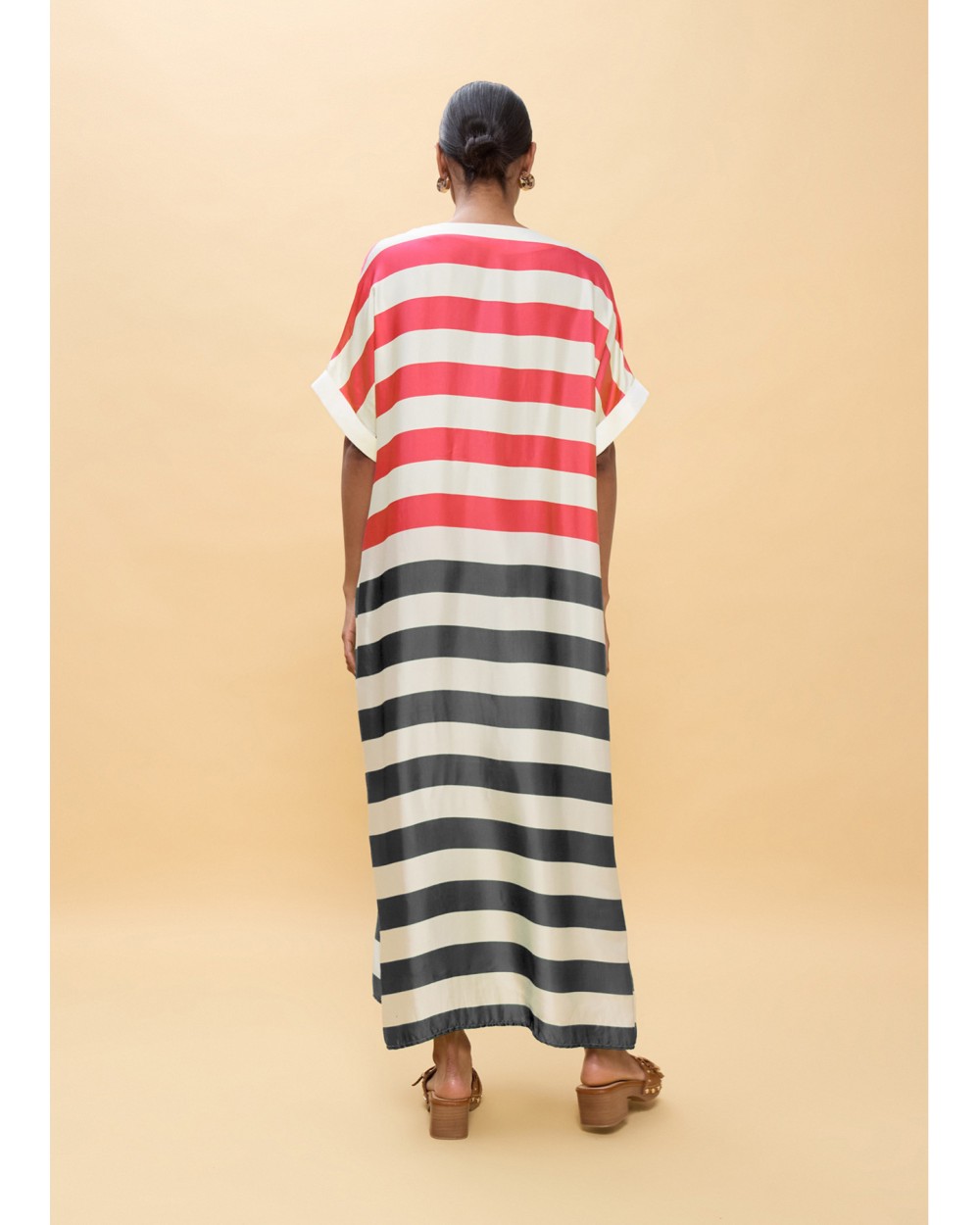 Vestido largo de líneas fluidas con diseño a rayas tricolor. Tejido ligero y fresco, con cuello en V y mangas cortas caídas. Ideal para dar un toque de color a tus salidas veraniegas. Combina con sandalias para un look casual o tacones para una ocasión
