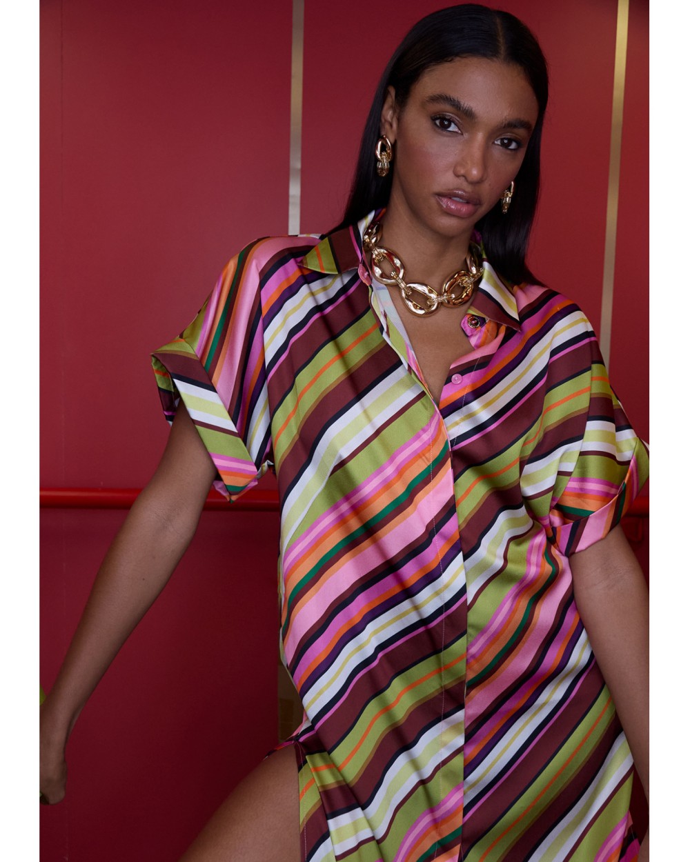 Vestido satinado camisero con estampado de multirayas en vibrantes tonalidades. Corte fluido con aberturas laterales y mangas cortas. Cuello de solapa clásico y botones frontales. Ideal para lucir con estilo en eventos diurnos de verano.