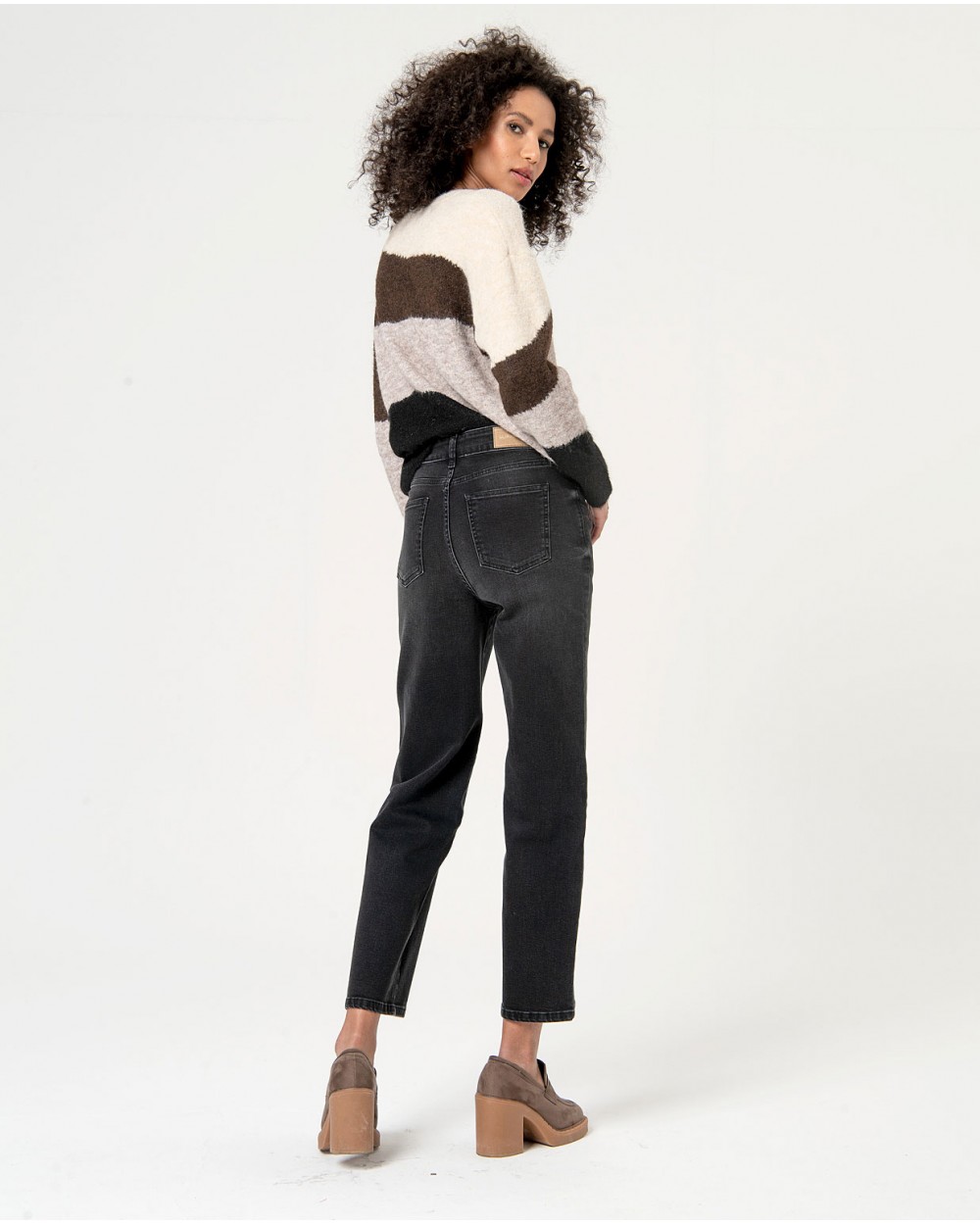 Tejano elástico tiro alto y corte recto, con bolsillos traseros y delanteros. Color liso.