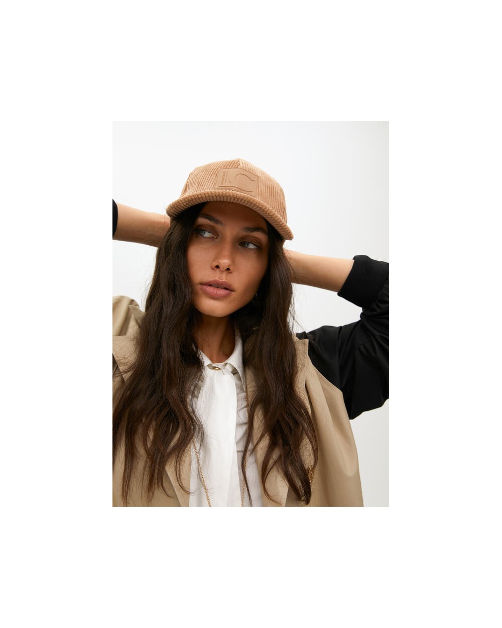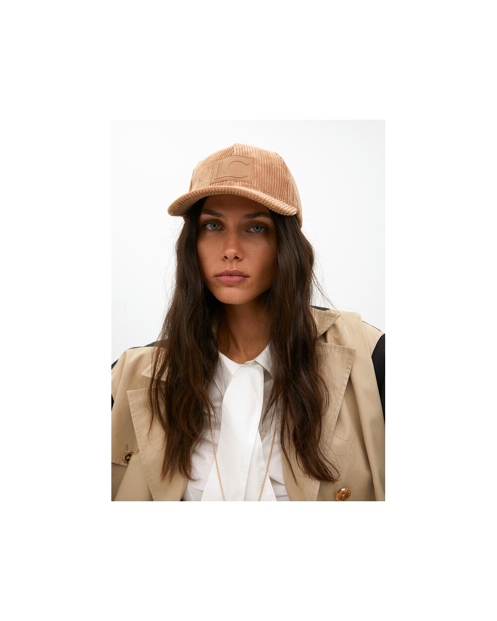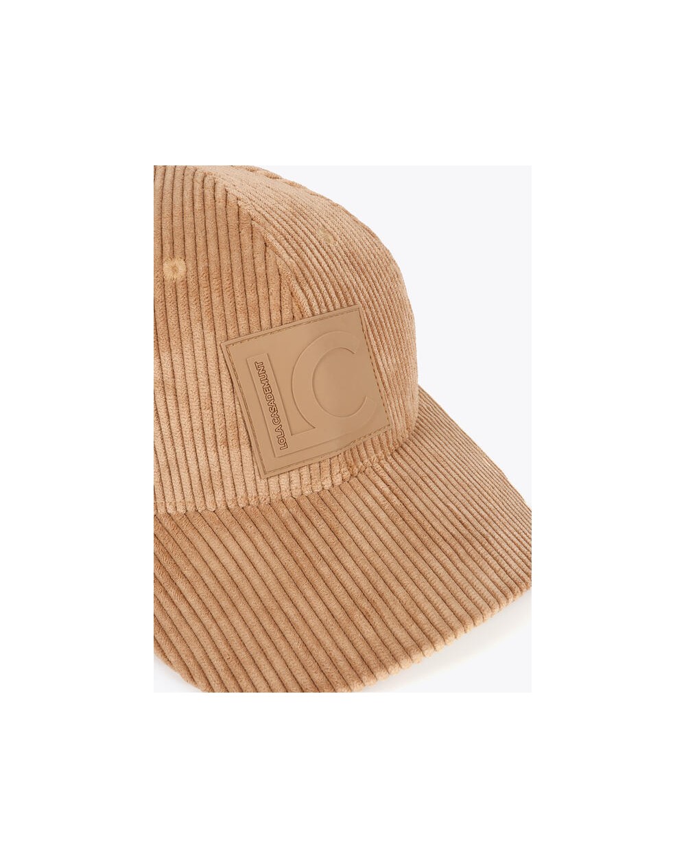 Visera de pana beis de Lola Casademunt, con logo LC bordado en hilo marròn, ajustable con hebilla atràs.