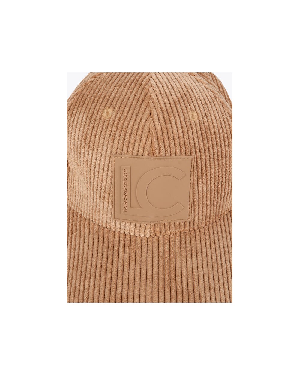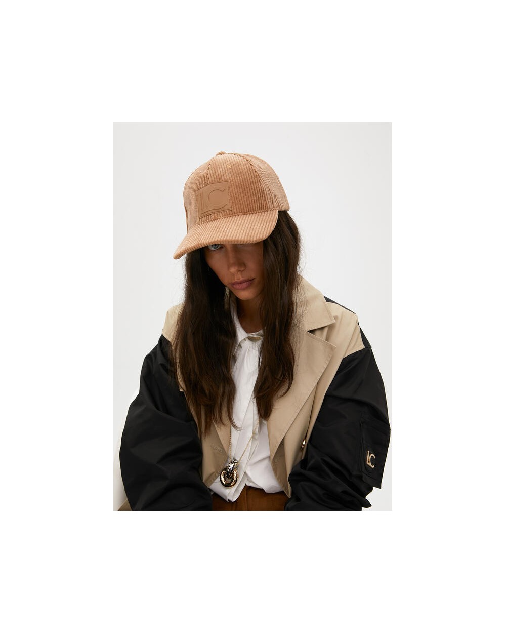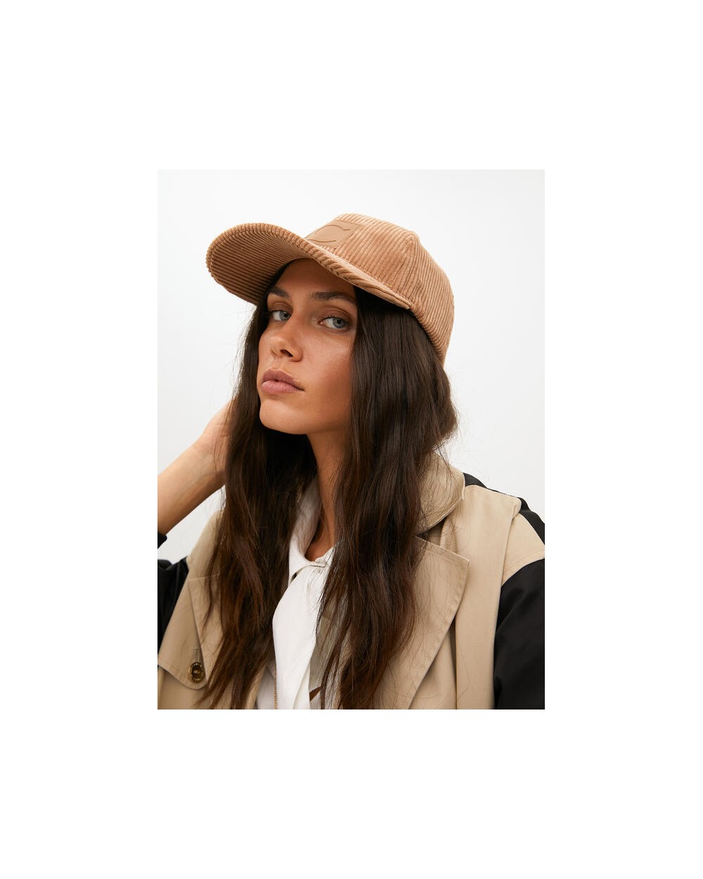 Visera de pana beis de Lola Casademunt, con logo LC bordado en hilo marròn, ajustable con hebilla atràs.